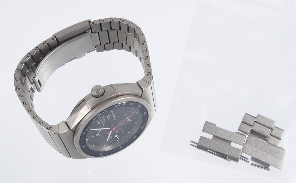 Porsche Design. Automatikwerk. Wasserdicht bis 60 Meter. Schwarzes Zifferblatt, Hilfszifferblätter für 30-Minuten- und 12-Stundenzähler. Kleine Sekunde, Fenster für Wochentag und Datum. Tachymeterskala. Armband mit Doppelfaltschließe, 6 Armband-Ersatzglieder. Bedienungsanleitung. Uhr nicht funktionstüchtig, Service nötig.