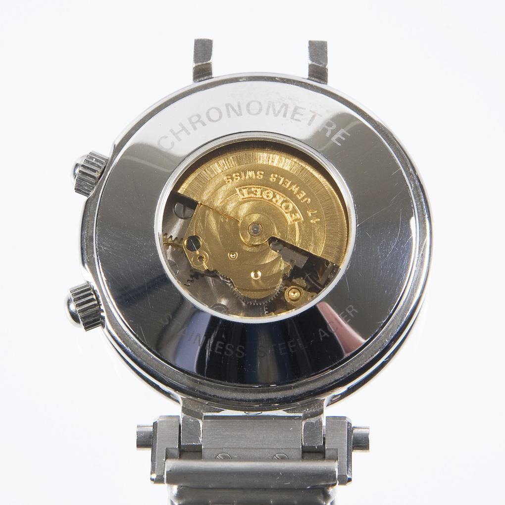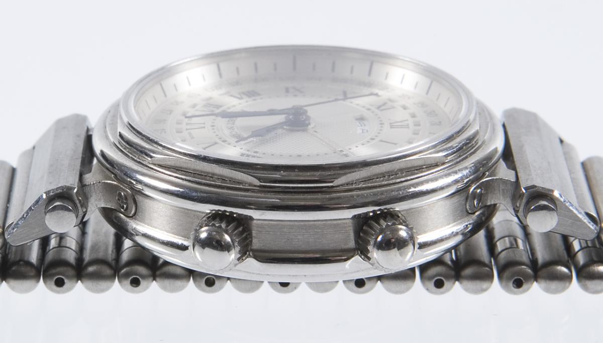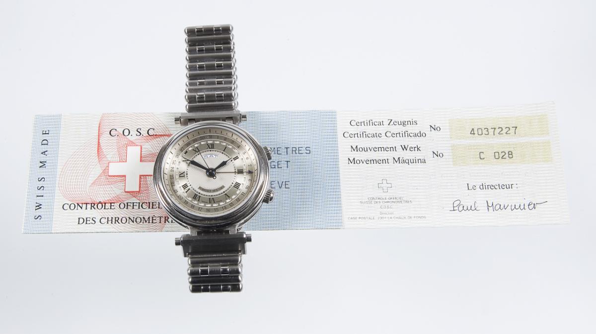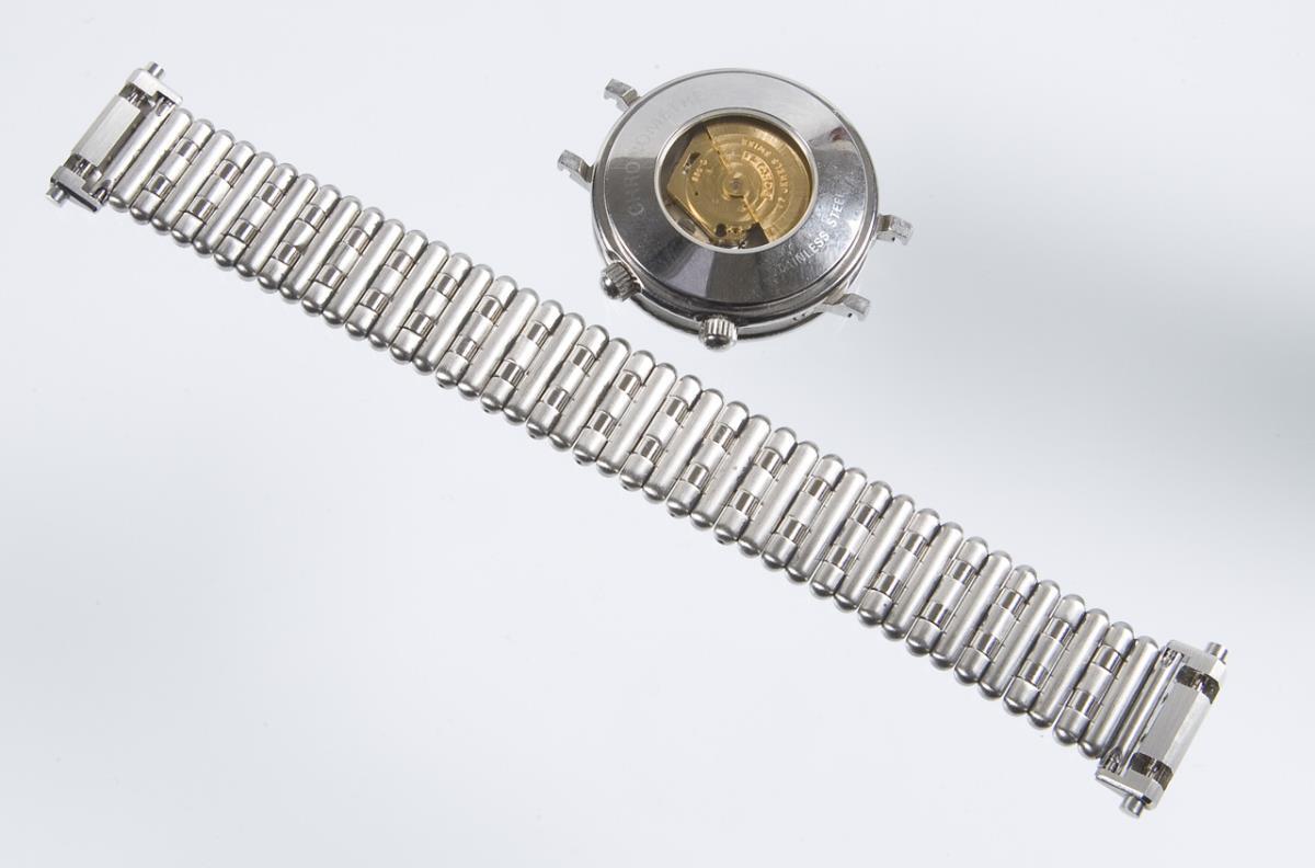 Automatikwerk mit Weckfunktion und Datum. Kaliber C 155. Wasserdicht bis 30 Meter. 17 Steine. Saphirglas, mittig guillochiertes massives Silber-Zifferblatt, gebläute Stahlzeiger. Fenster für Wochentaganzeige in Englisch. Große Sekunde, Weckerzeiger. Boden mittig verglast. Armband mit patentierten Schließen zum Befestigen oder Lösen. Gangprüfung-Zertifikat, Garantieschein. Im Kurzzeit-Test funktionsfähig.