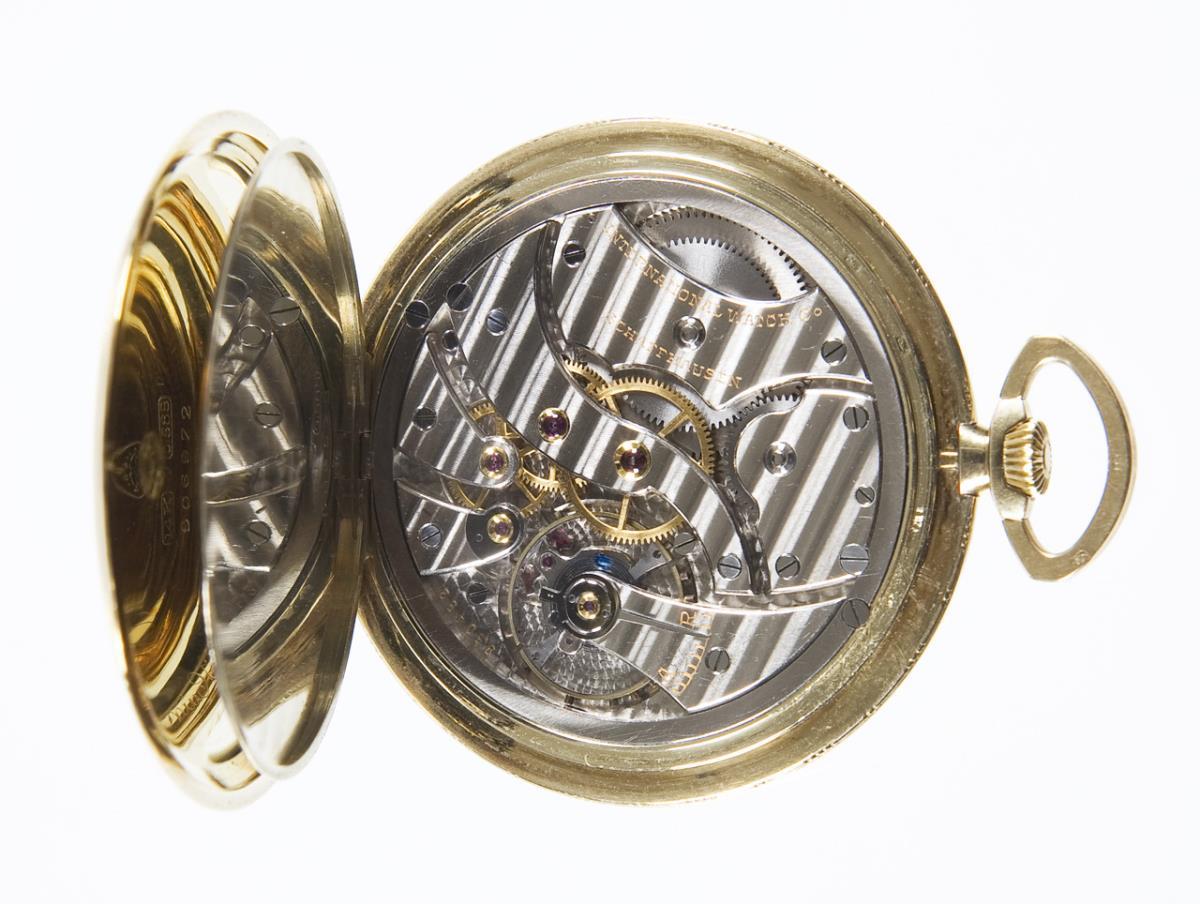 Kronenaufzug. Brücken-Ankerwerk mit Genfer Streifen. Silbernes Zifferblatt, goldene arabische Zahlen, Goldzeiger, kleine Sekunde. Gehäuse mit Streifendekor, Innendeckel mit graviertem Namenszug. Garantiekarte. Original-Etui, Karton. Im Kurzzeit-Test funktionsfähig. Zahl 2 bei 12, Beschichtung vom Etui defekt.