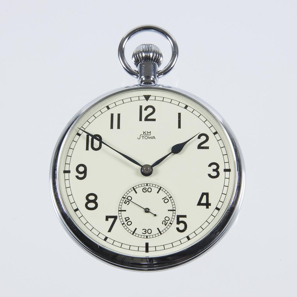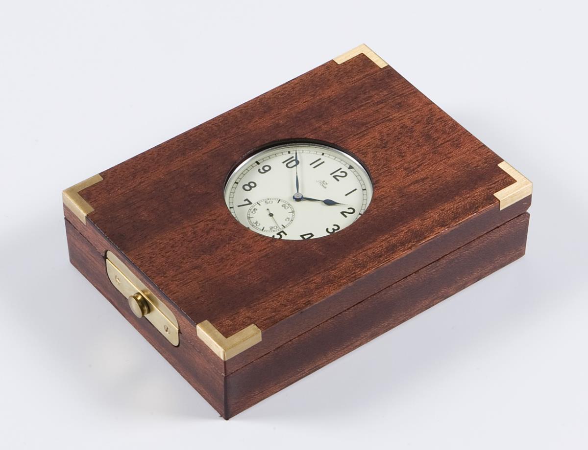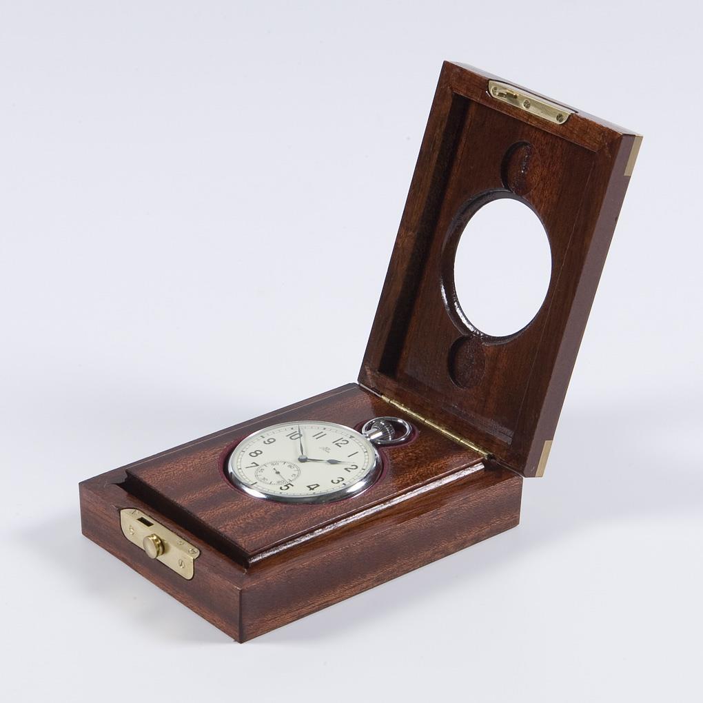 Beobachtungsuhr für die deutsche Kriegsmarine. Kronenaufzug. Verglastes Brücken-Ankerwerk mit Schwanenhals-Feinregulierung. 19 Steine. Leuchtzifferblatt, schwarze arabische Zahlen, gebläute Stahlzeiger, kleine Sekunde. Holz-Etui. Im Kurzzeit-Test funktionsfähig.