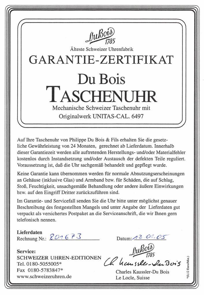 Kronenaufzug. Kaliber Unitas 6497. Mit 17 Steinen. Schwarzes Zifferblatt, arabische Zahlen und Zeiger mit Leuchtmasse, kleine Sekunde. Uhrkette mit Karabiner und Federring. Garantie-Zertifikat, Verkaufsjahr 2005, Bedienungsanleitung. Neutrales Etui. Im Kurzzeit-Test funktionsfähig.