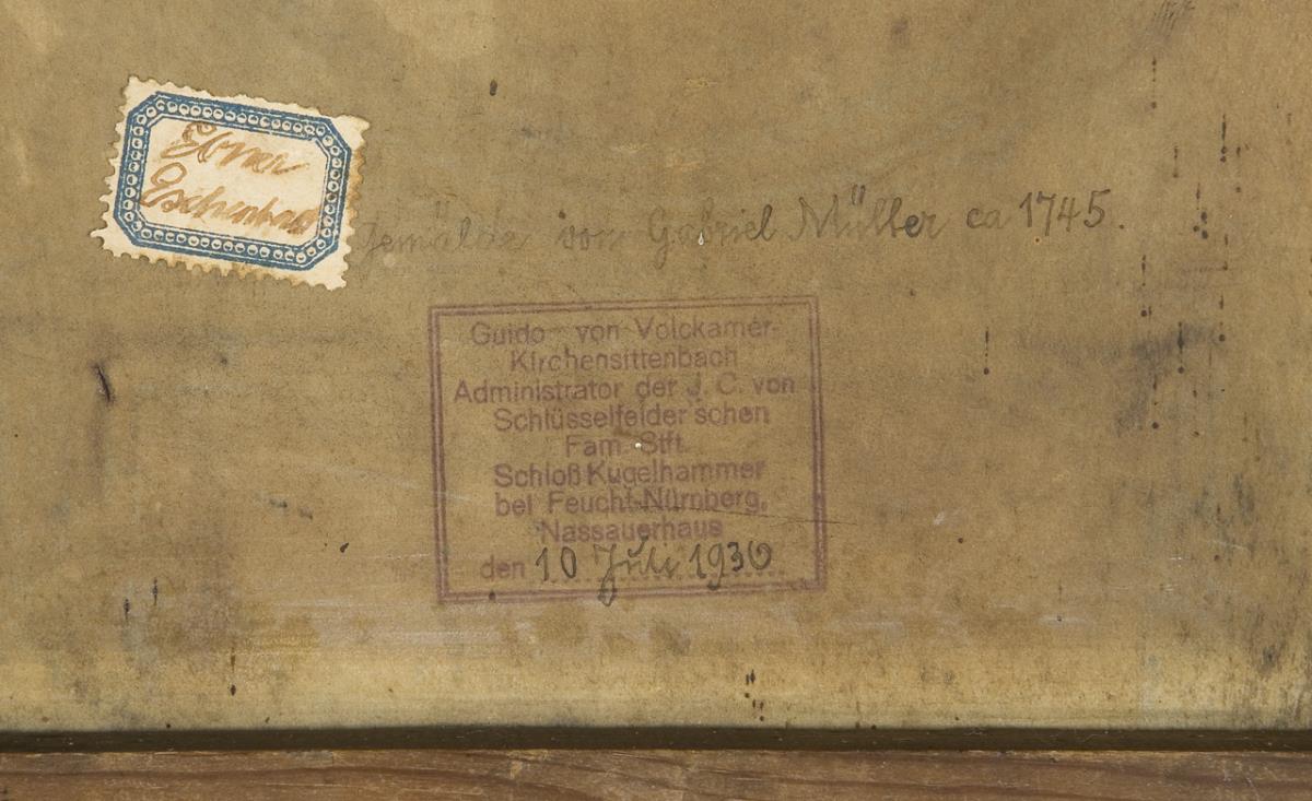Provenienz : Guido von Volckamer`sche Familien-Sammlung, München sowie Guido Volckamer von Kirchensittenbach, Administrator der J.C. von Schlüsselfelder`schen Familien-Stiftung, Schloss Kugelhammer, bei Feucht-Nürnberg, Nassauer Haus 10. Juli 1930 (Guido Volckamer, 1860 Passau - 1940 München, Kunstsammler und Fotograf. Ein Teil seiner Sammlung wurde in das Germanische Nationalmuseum aufgenommen).