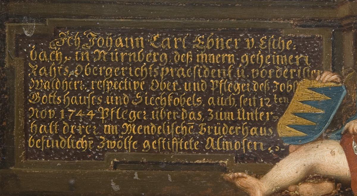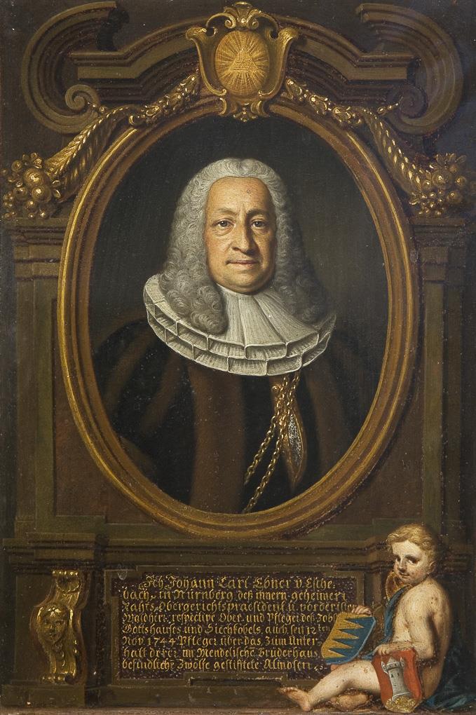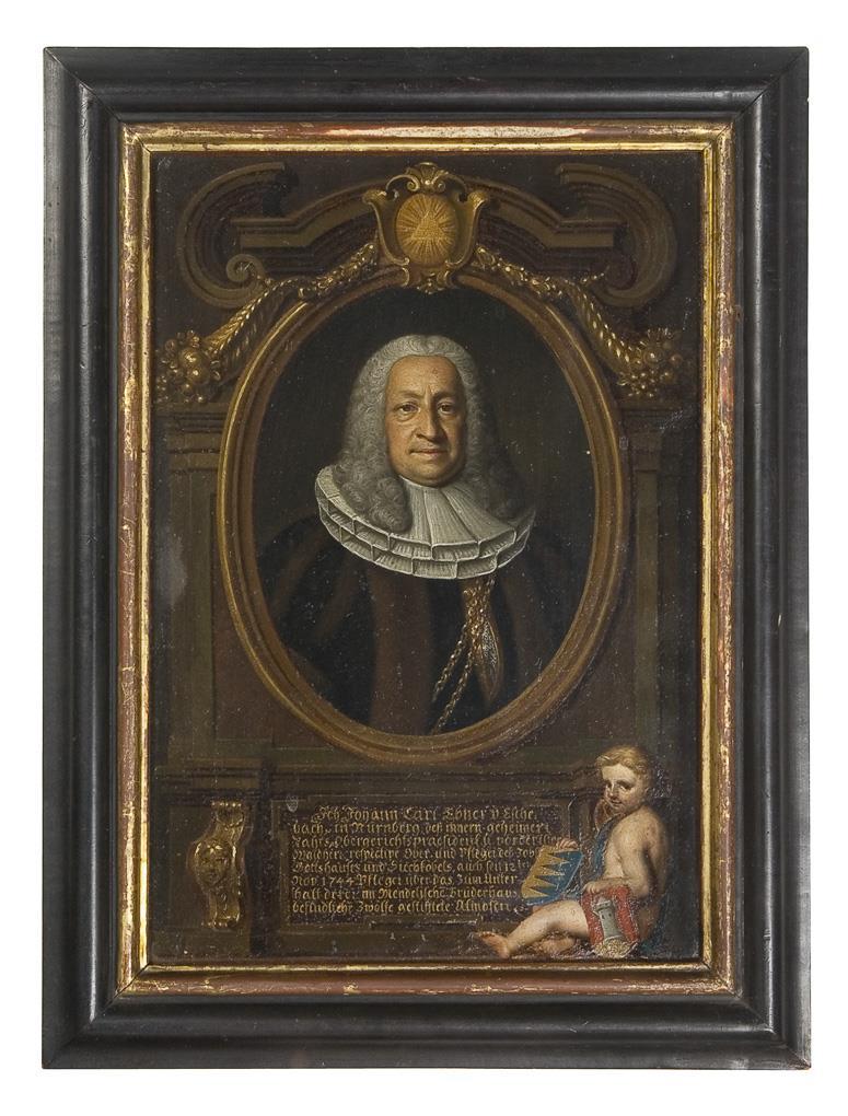 Ratsmitglied als Mitglied des Appellationsrates in Nürnberg, Gouverneur der Mendelschen Zwölfbrüderstiftung und der Sankt Jobster Stiftung. Ebner trägt Pelzhaube, Mühlsteinkragen, Perücke und die goldene Kette der Patrizier. Unten Amorette mit seinem Wappen und dem Wappen seiner Gattin Maria Christina, geborene von Harsdörfer, Schriftkartusche. Rückseitig Sammlungs-Stempel, alt bezeichnet. Originaler Profilrahmen.