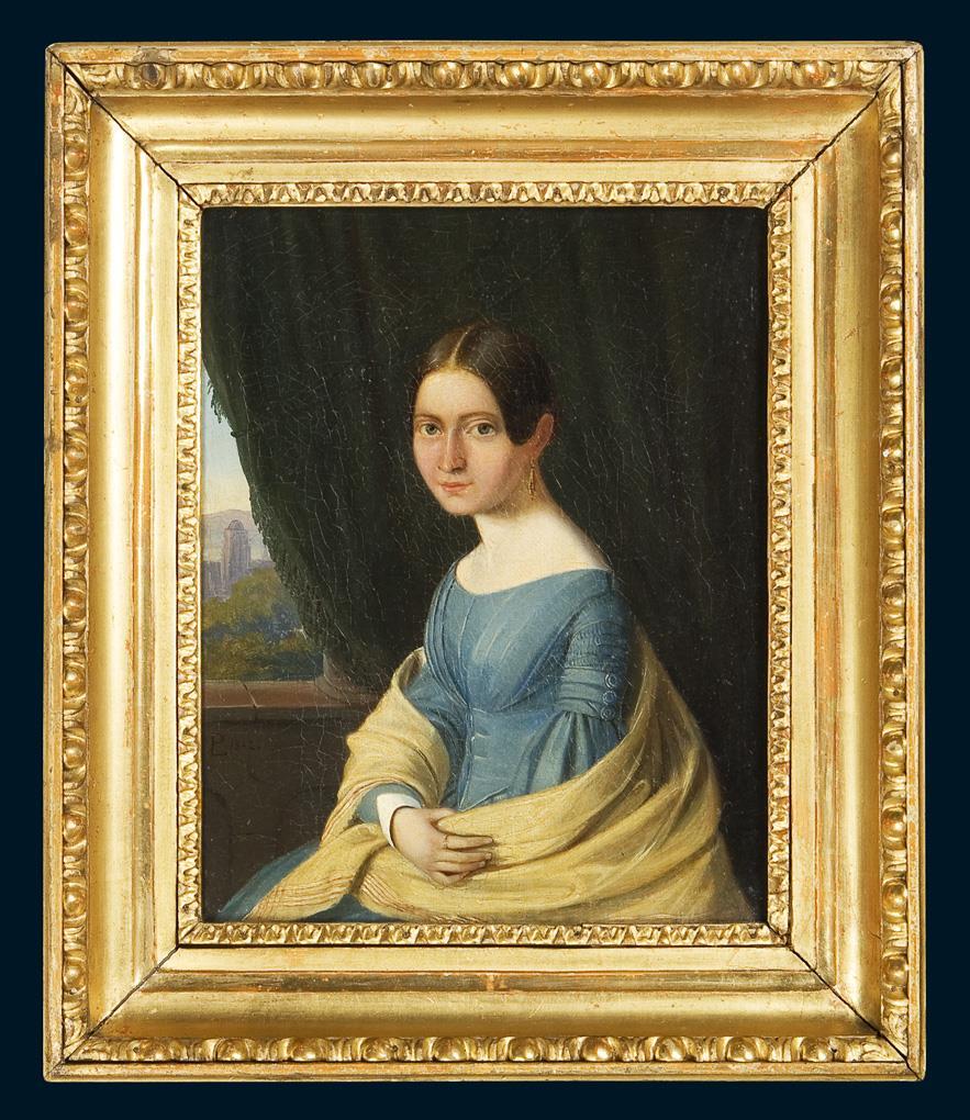 Bürgerlich schlicht präsentiert sich die junge Dame vor einem drapierten Vorhang und Landschaftsausblick. Originaler Goldrahmen. Doubliert, Craquelé.