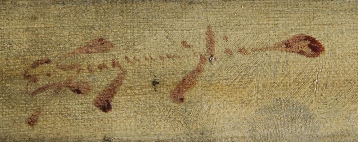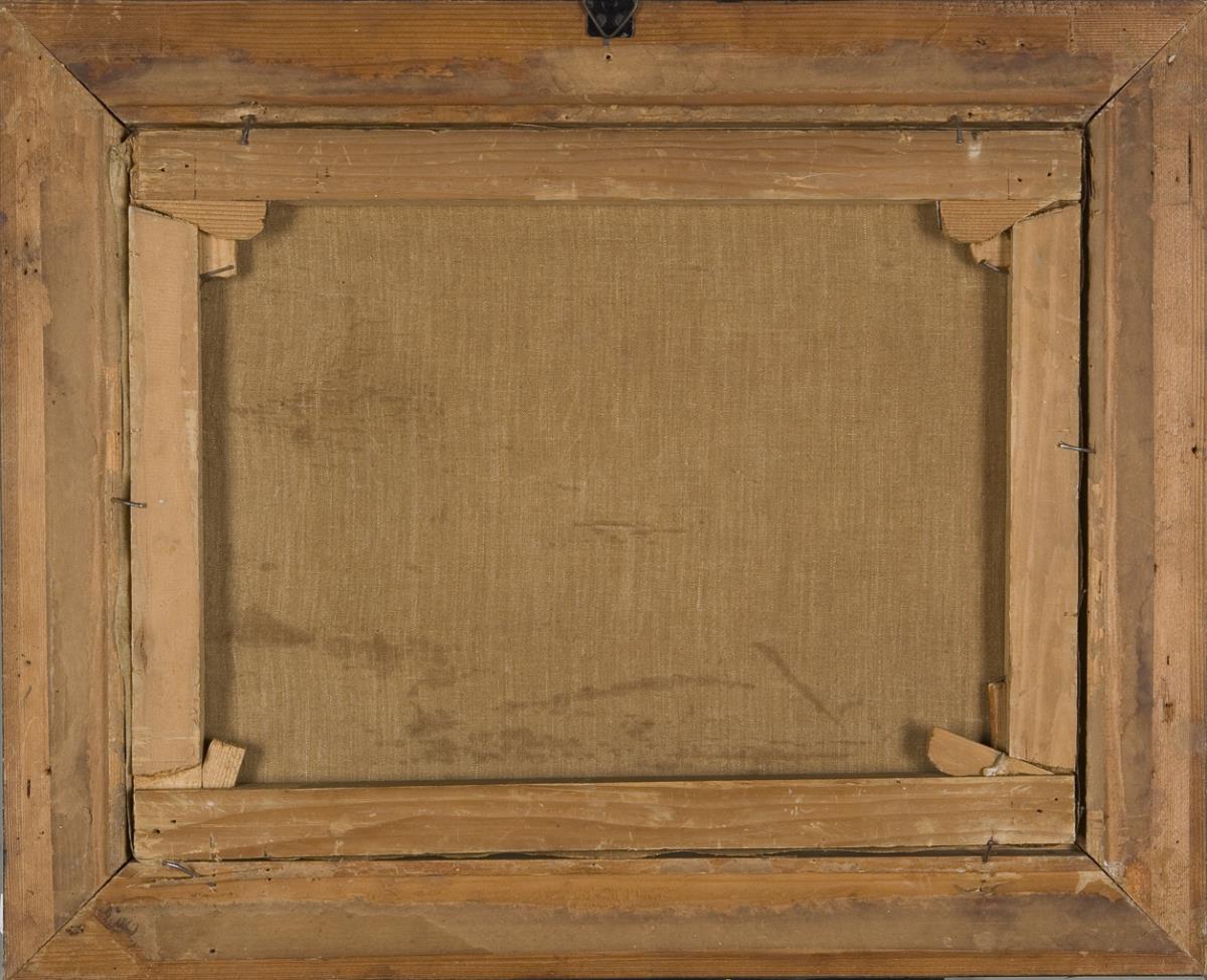 Zeitgenössische Kopie eines italienischen Genremalers. Das Motiv ein fröhliches und idyllisches Bild des italienischen Landlebens. Schwarzbraun lackierter Profilrahmen mit schmaler Stuckleiste. Stuckleiste partiell defekt.