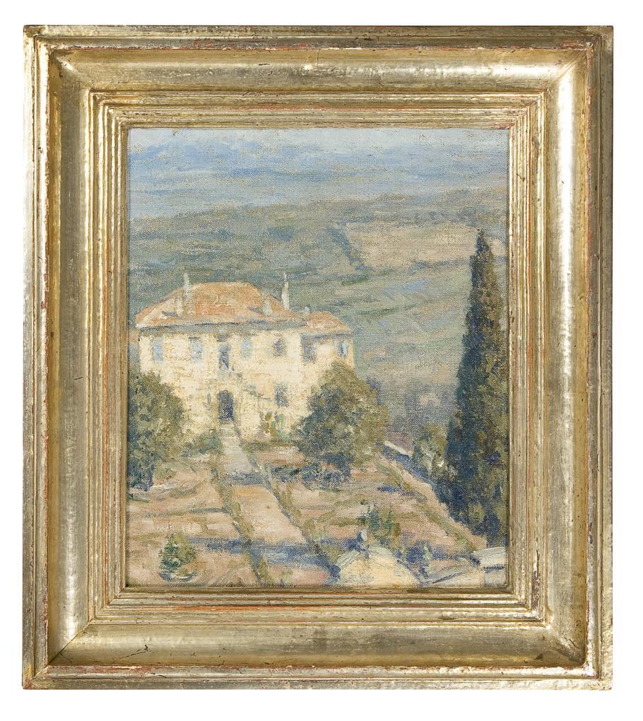 Das Anwesen steht im Sonnenlicht des Südens. Die Landschaft ist kompositorisch reizvoll gegliedert. Profilierter Goldrahmen mit Klebezettel der Gebrüder Renz, Stuttgart.