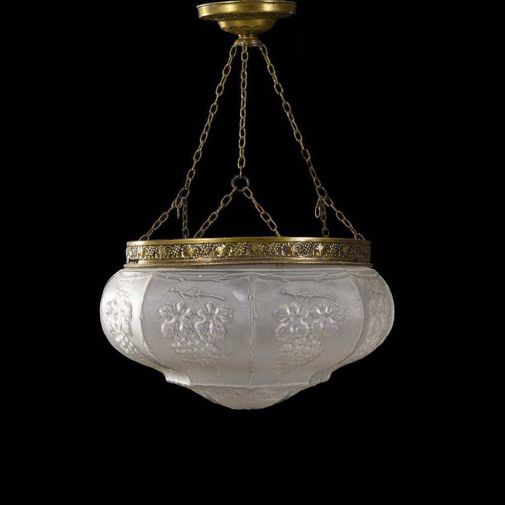 Schalenlampe mit Glasschirm an 3-facher Kettenaufhängung und Rosettenbaldachin; Glasschirm mit reliefiertem Weintraubendekor. Leichte Alters-/Gebrauchsspuren.