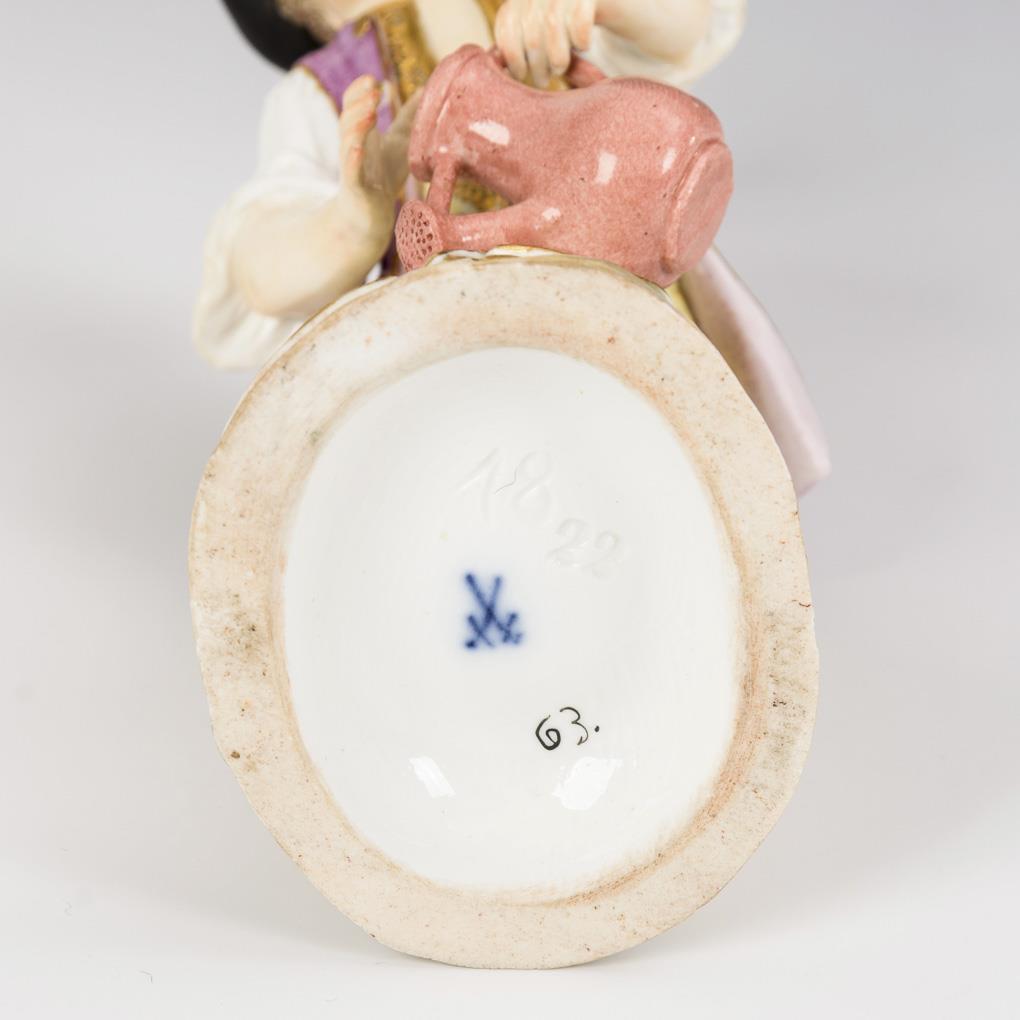 Auf einem Rocaillesockel stehender, gießender Gärtnerknabe. 2 Bestoßungen am Hutrand, 1 Bestoßung am Gehrock, 2 minimale Chips am Sockelrand.