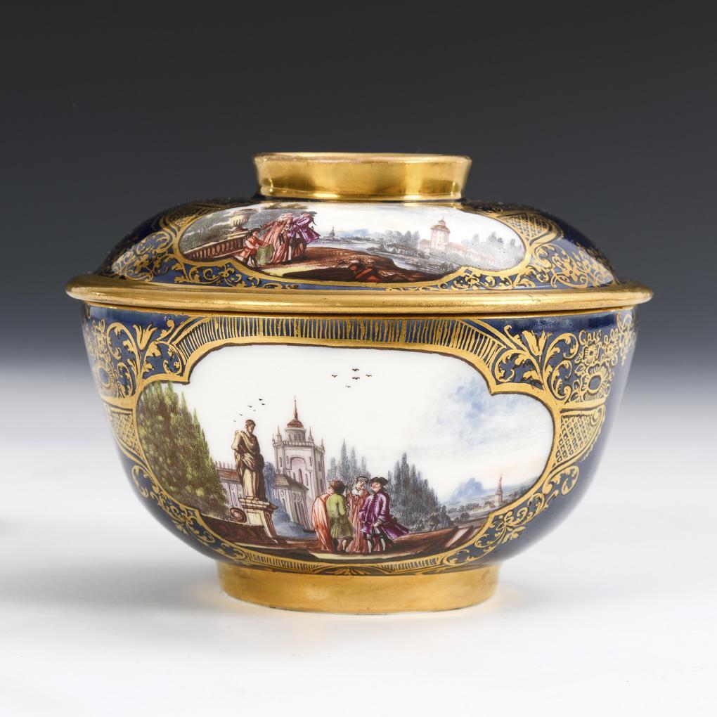 Seltene Dose mit ornamentaler Goldmalerei auf kobaltblauem Fond. In den jeweils 2 Vierpasskartuschen auf Wandung und Deckel qualitätvoll gemalte Landschaften mit Architektur, Reiterszenen und Personenstaffage. Die Form, die den Wöchnerinnenterrinen ähnelt, greift auf asiatische Vorbilder zurück. Der Deckel mit hohem vergoldeten Griffring kann als Schale verwendet werden. Sehr guter Zustand, minimaler Goldabrieb am Deckelrand innen.
