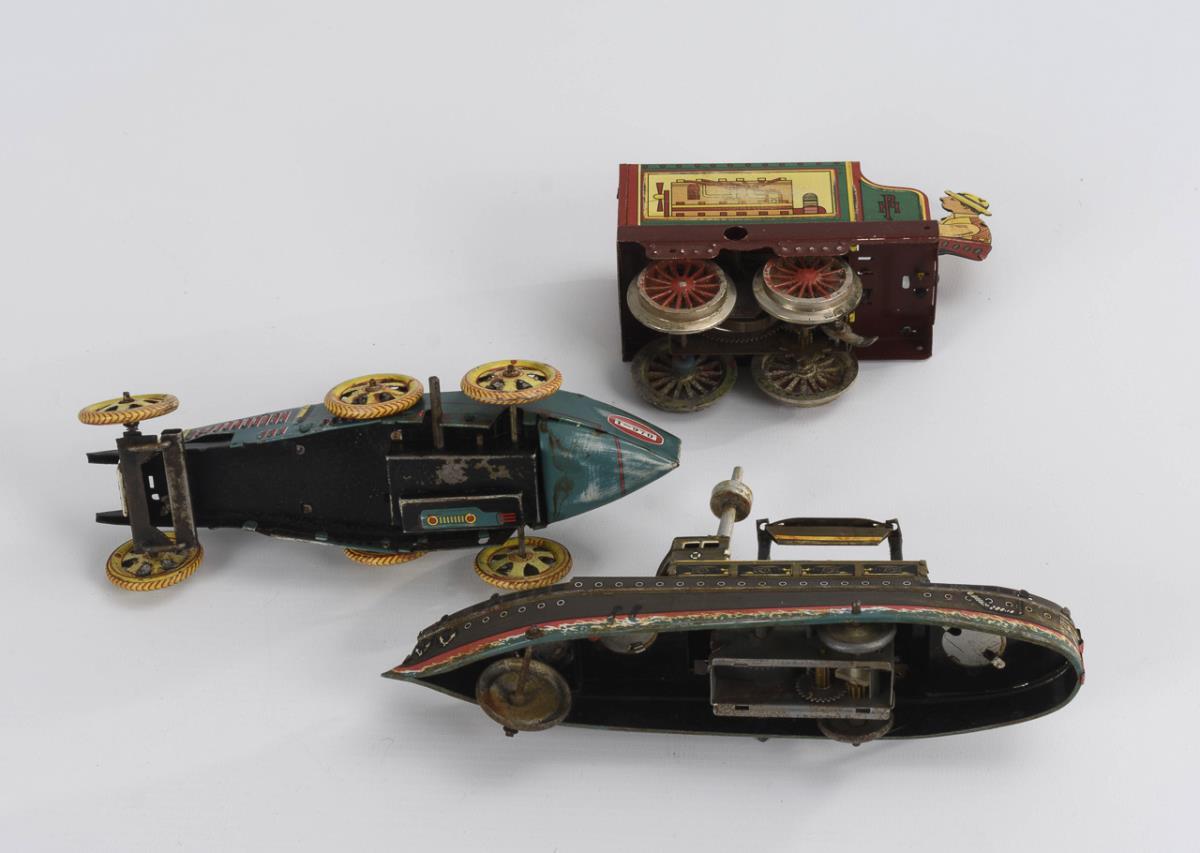 Rennwagen Bugatti "I-970" in Karton "Sparking Racer 211". / Blechschiff "1038". / Lok "Dinky Supertoys 1057" mit Lokführer. Uhrwerke intakt, ohne Schlüssel. Blech und Kartons mit künstlichen Alterungsspuren.
