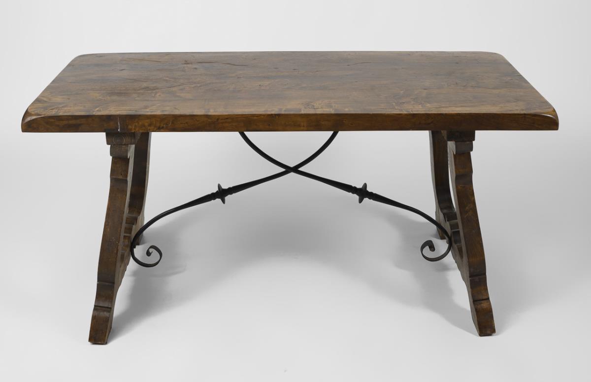 Schwerer, rechteckiger Tisch auf geschweiften, fußverstrebten Steitenstützen mit ziervoller Kreuzverstrebung aus volutiertetem Schmiedeeisen. Alters-/Gebrauchsspuren.