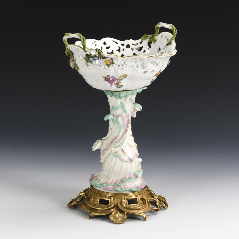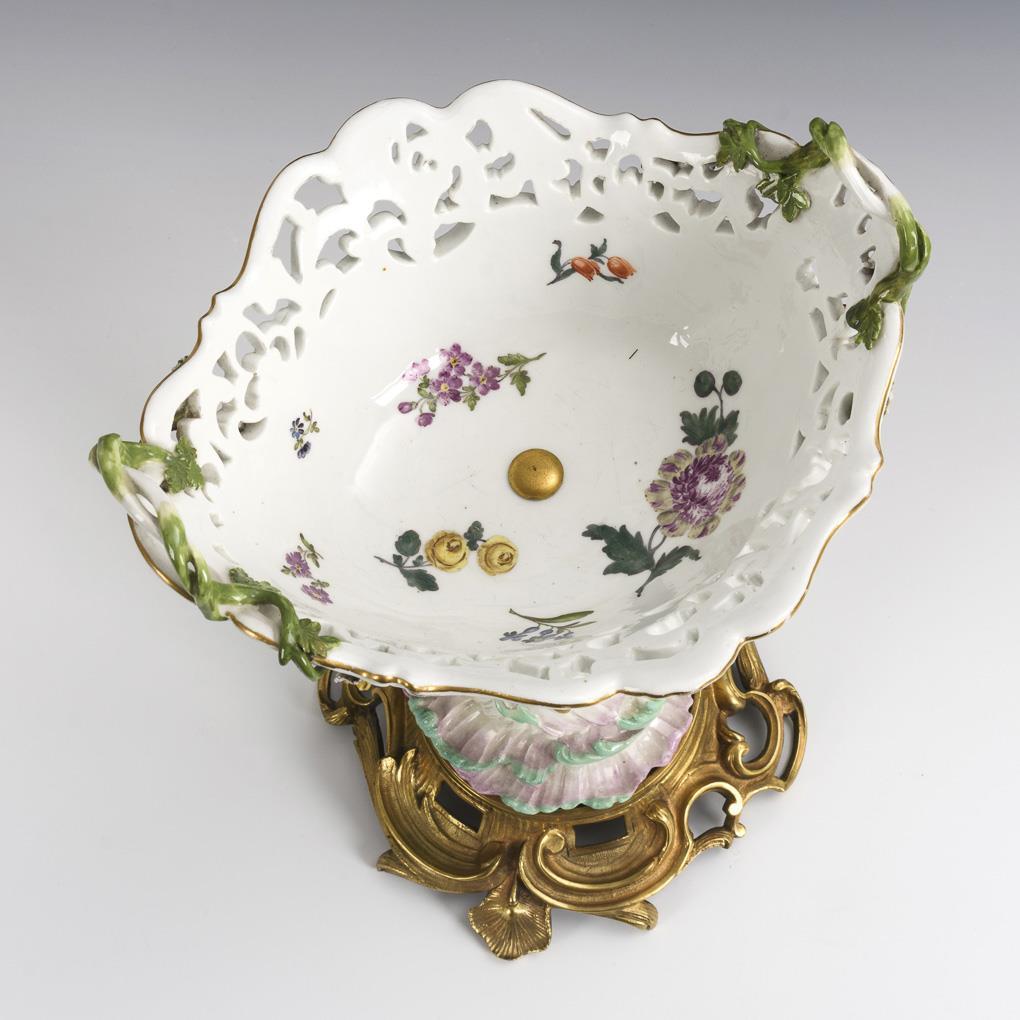 Oval-vierpassiger Korb mit Floralrelief, zwei Asthandhaben und rocailledurchbrochenem Rand, mit Blütenbelag und Blumenmalerei. Auf ergänztem Rocailleschaft, dieser mit rocailledurchbrochener Bronzemontierung. Bestoßung am oberen Schaftansatz, 1 Handhabe restauriert.