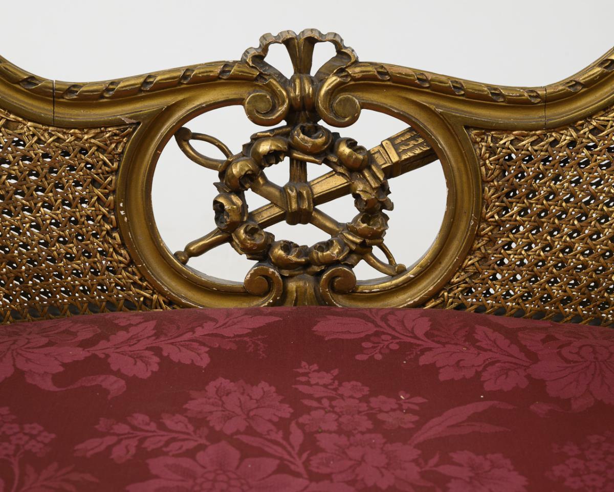 Kleines Korbgeflecht-Sitzmöbel im klassizistischen Stil, mit Ohrenbacken-Seitenteilen "à oreilles" und zentralem à jour gearbeitetem Schnitzwerk, auf kannelierten Beinen; Sitzflächenauflage mit weinrotem Bezug mit Floralmuster. Alters-/Gebrauchsspuren, Korbgeflecht mit Beschädigung, Fassung teils berieben.