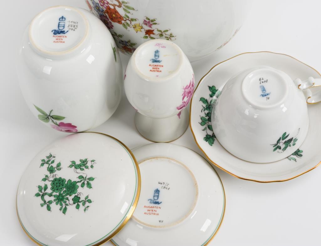 8 Teile. Verschieden Floralmalerei (u.a. kupfergrün, purpurfarben, bunt). 3 Vasen (8,5, 10 und 18 cm), Cachepot (H 12,5 cm), flache Dose (Ø 9,5 cm), Mokkatasse (H 5 cm) mit Untertasse (Ø 11,5 cm) und Blattschale (17,5 cm).