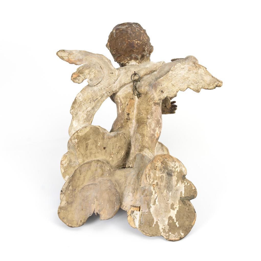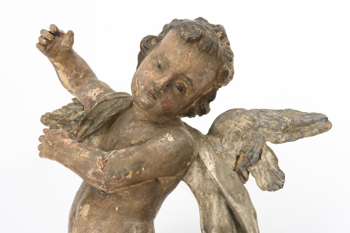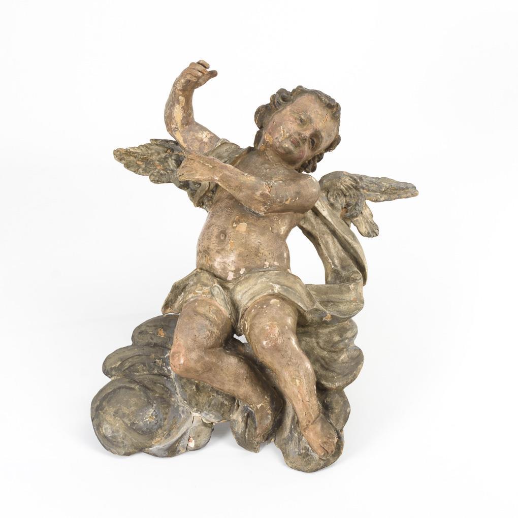 Über den Wolken schwebender Putto, der etwas in den Händen hielt. Starke Alters-/Gebrauchsspuren, kleines Fehlstück und gelockertes Stück an den Wolken.