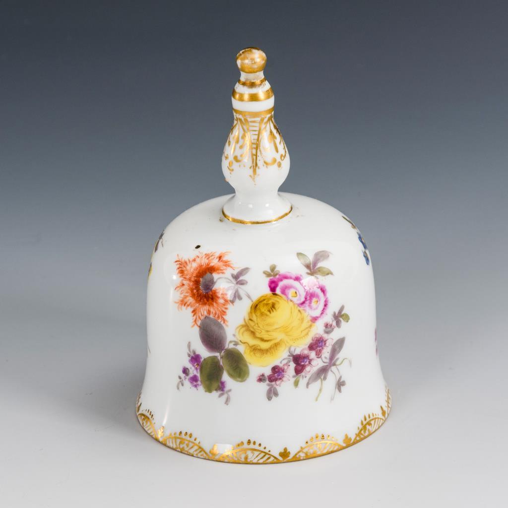 Glocke mit Blumenmalerei und Goldspitzenbordüre. Minimaler Goldabrieb am Knauf.
