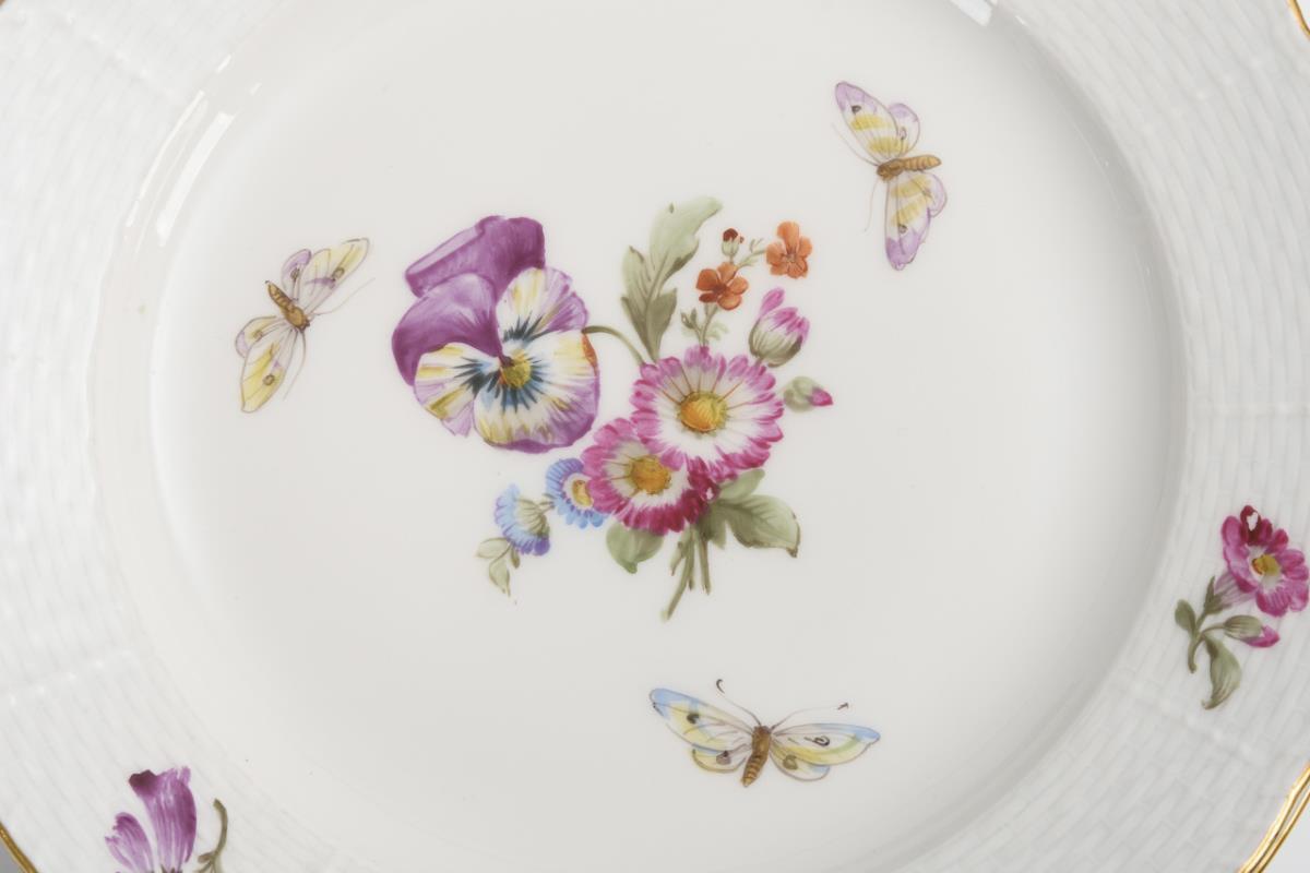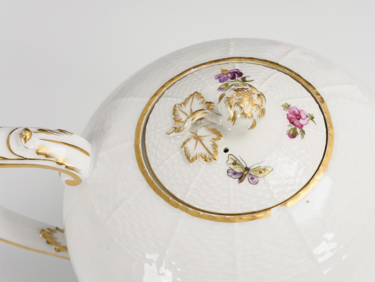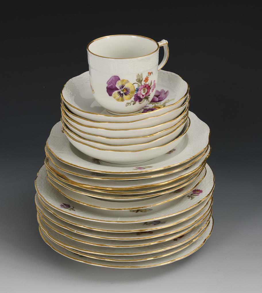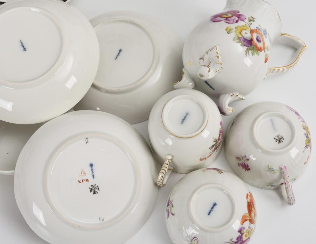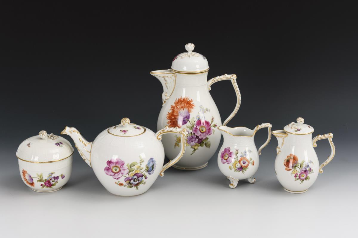 43 + 1 Teile. Modell "Altozier" und "Neuozier". Kaffeekanne (H 26,5 cm), Teekanne, Zuckerdose, 2 verschiedene Milchkännchen, 6 Kaffeetassen mit 6 Untertassen, 7 Teetassen mit 6 Untertassen, 7 Frühstücksteller und 6 Kuchenteller. Dazu 1 einzelner Deckel. Chip am Rand der Teekanne, Haarriss an der Schneppe der Teekanne, Bestoßung am Knauf und Standring der Kaffeekanne, Brandriss in der Schneppe der Kaffeekanne, Chip an 1 Teetassenrand, partiell minimaler Goldabrieb.