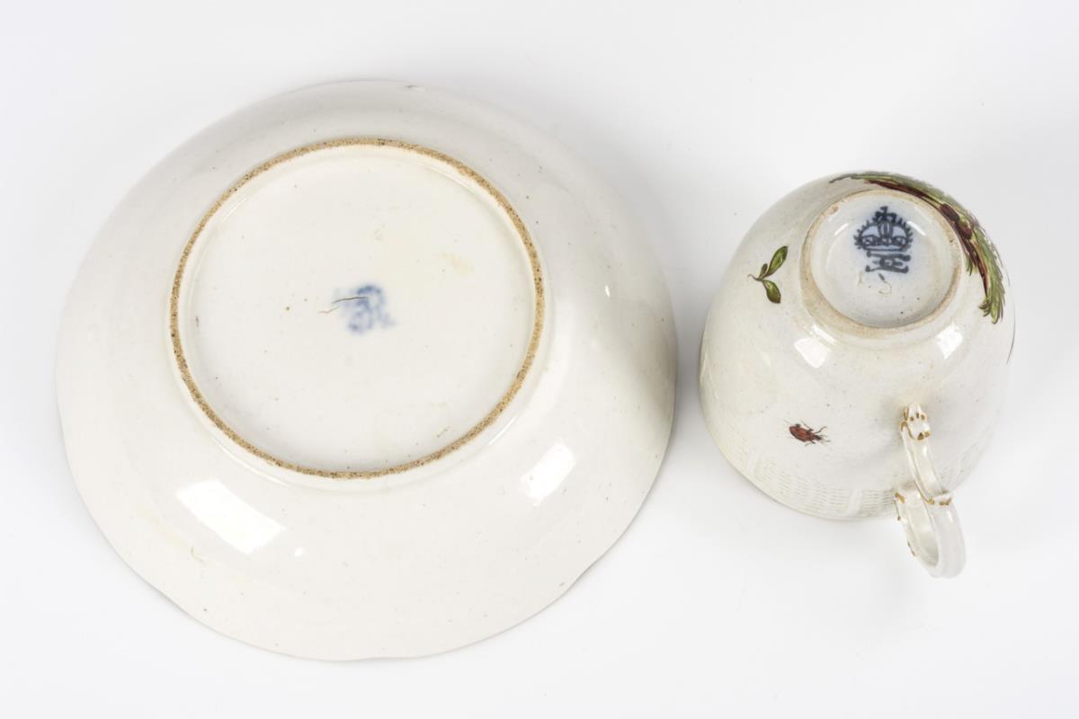 Mit dem Reliefdekor "Altozier", Tasse mit Rocaillehenkel. Schauseitig auf der Tasse sowie im Spiegel der Untertasse Vogel- und Schmetterlingsmalerei. Bestoßung am Standring der Tasse, unterseitig an der Untertasse eine kleine, aufgeplatzte Luftblase.