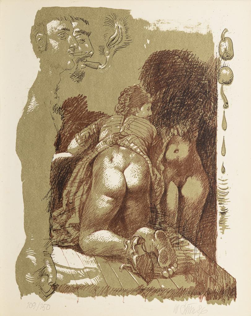 Blatt 1 von 6 Darstellungen mit erotischen Szenen aus der Folge "Baals Lied" zu Liebesgedichten von Bertolt Brecht, 1986