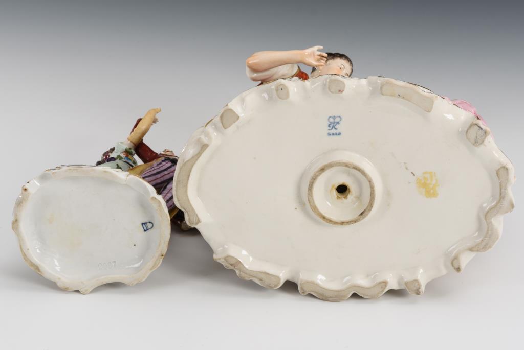 1x der schlafenden Geliebten einen Blumenkorb mit Liebesbrief hinstellender Gärtner und 1x tanzendes Empire-Paar. Gärtnergruppe: Oberkörper der Dame, rechte Hand des Gärtners und Baumstämme restauriert, Tanzpaar: Schleifenband der Dame defekt.
