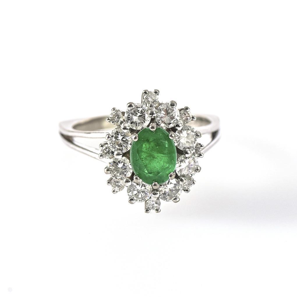 Weißgold 750 gestempelt. Ringgröße 57. Smaragd ca. 0,8 x 0,6 cm. Brillanten ca. Ø 0,2/0,3 cm. 6,0 g.