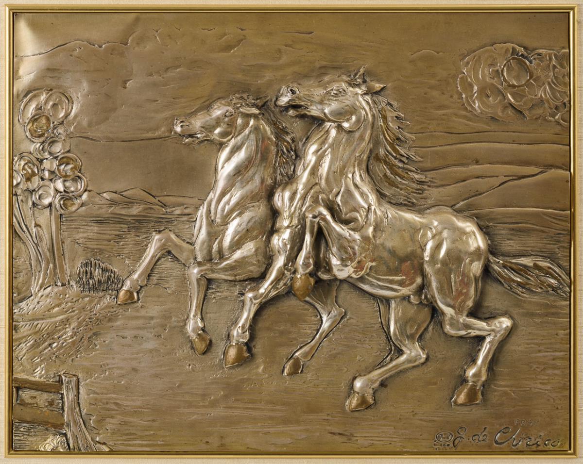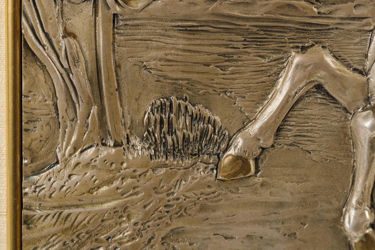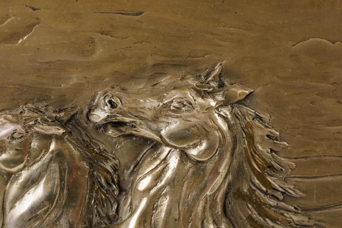 Versilbertes Relief im Rahmen: Pferdepaar