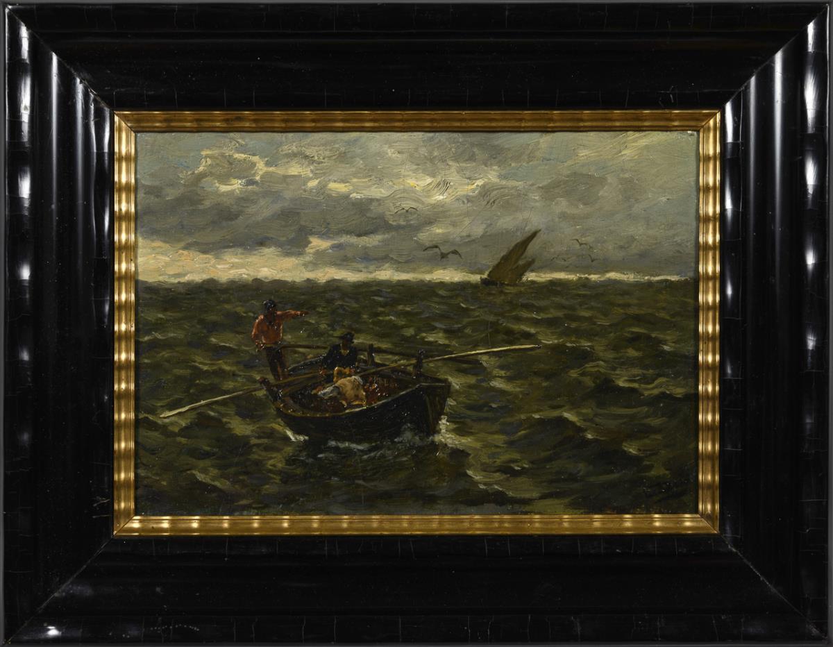 Ruderer im Boot nahe einem Segler auf dem offenen Meer unter wolkigem Himmel. Leichte Altersspuren.