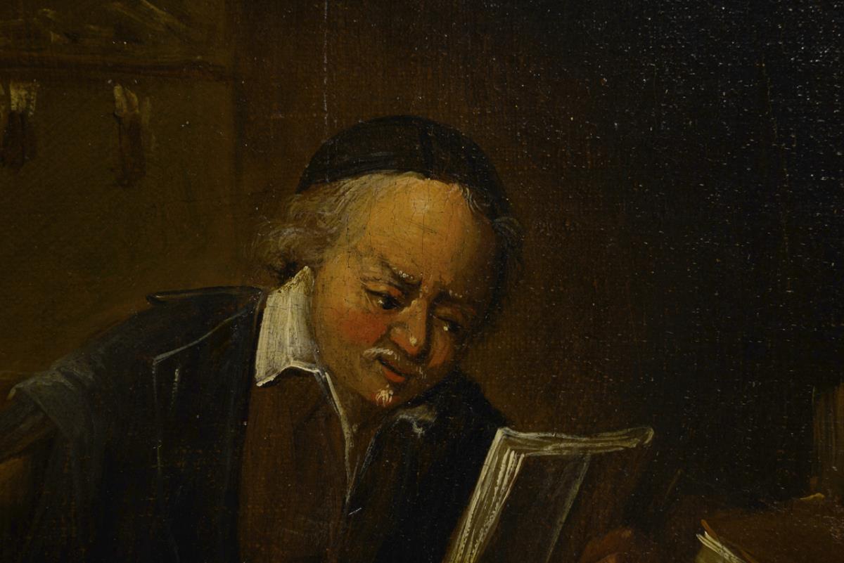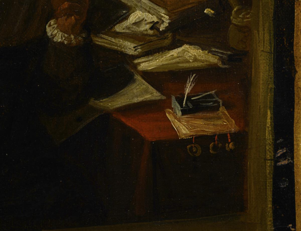 Darstellung eines Gelehrten beim Lesen an einem Tisch mit verschiedenen Büchern und Briefen. Leinwand doubliert, ein kleiner Defekt.