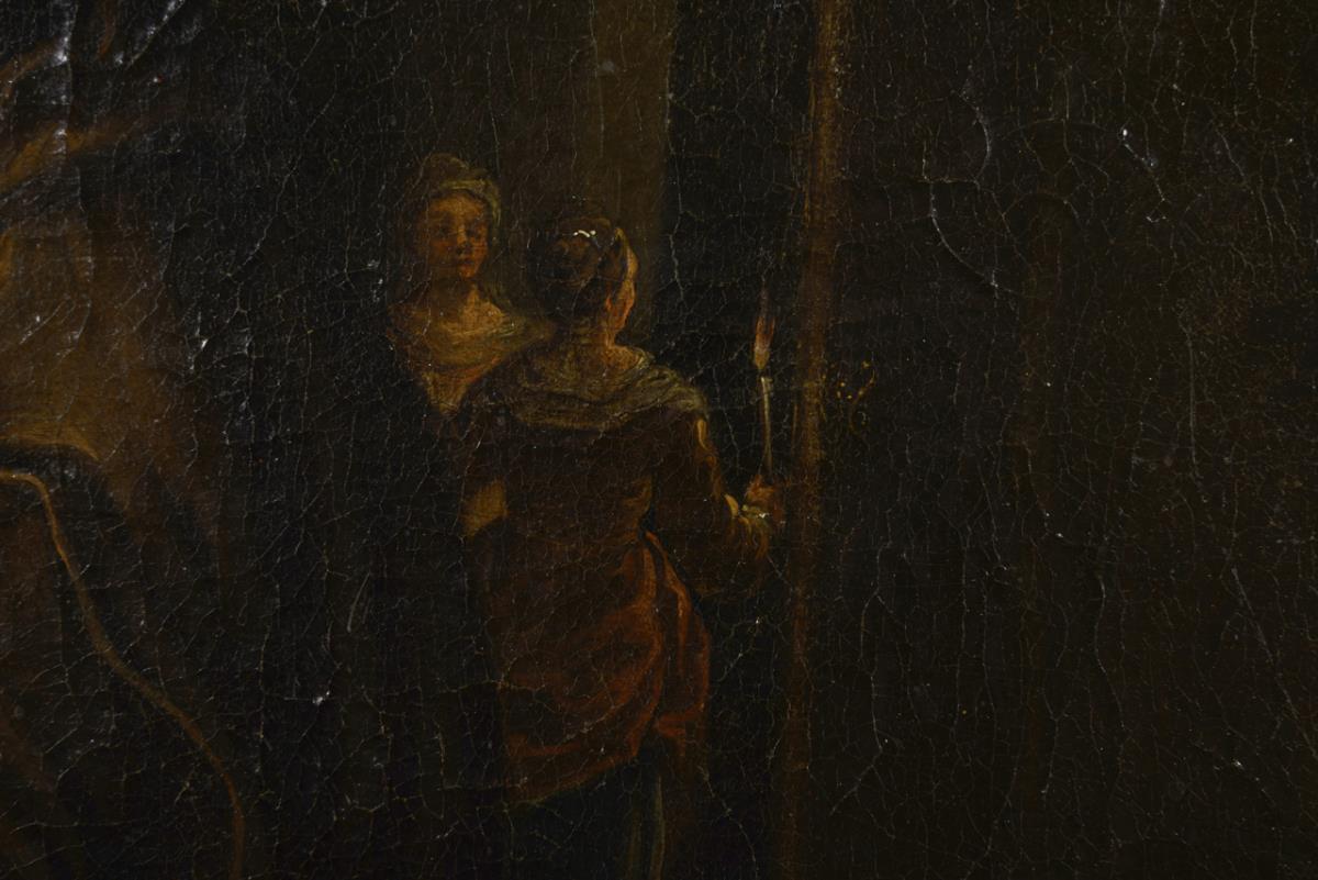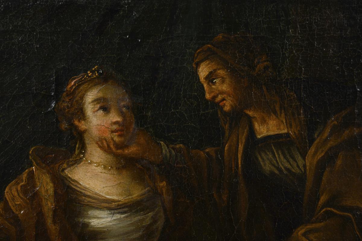Genreszene mit älterer Frau, welche eine gut gekleidete junge Frau im Kerzenschein begutachtet. Leinwand doubliert.