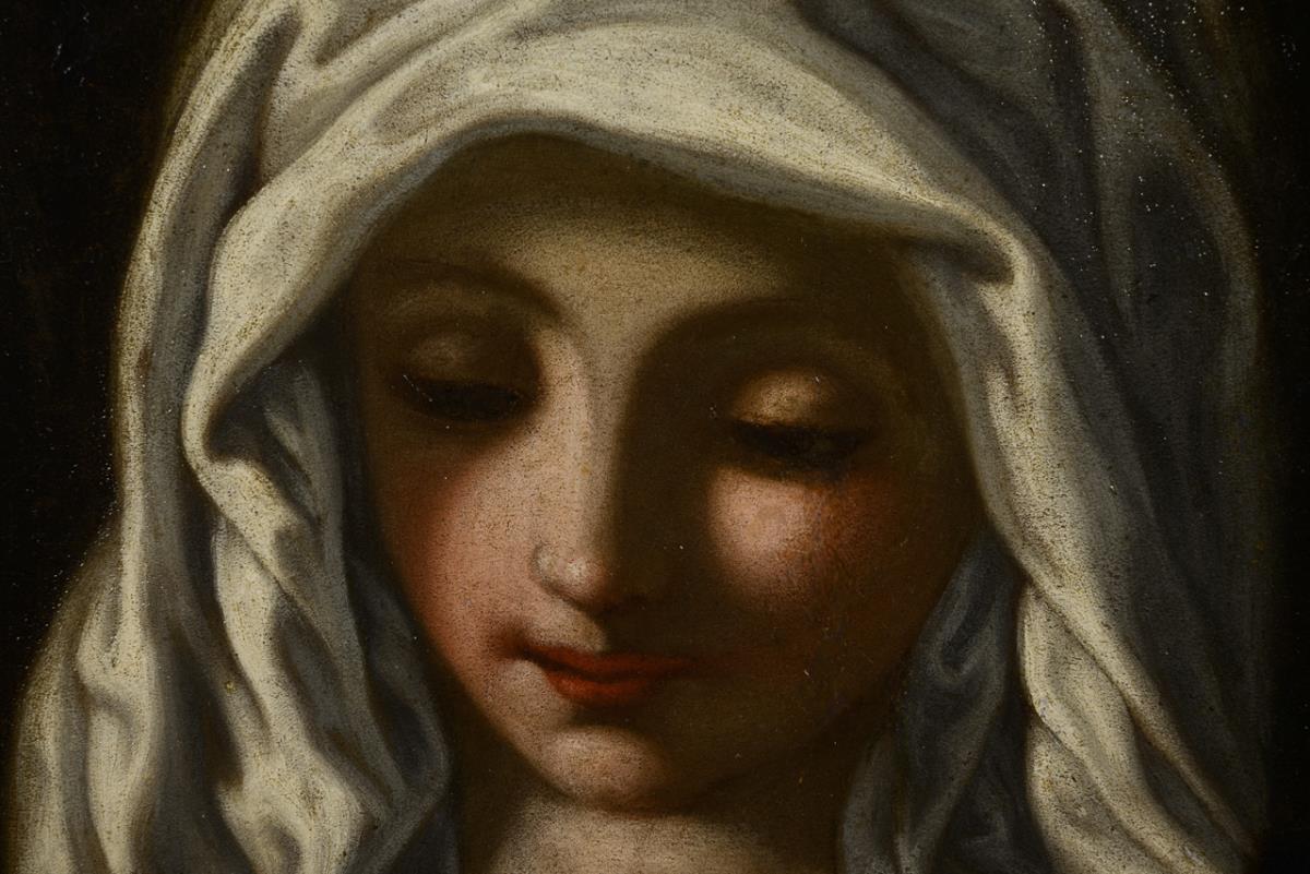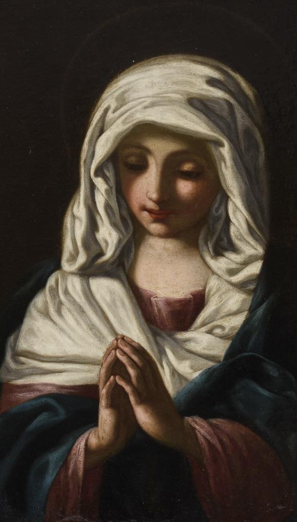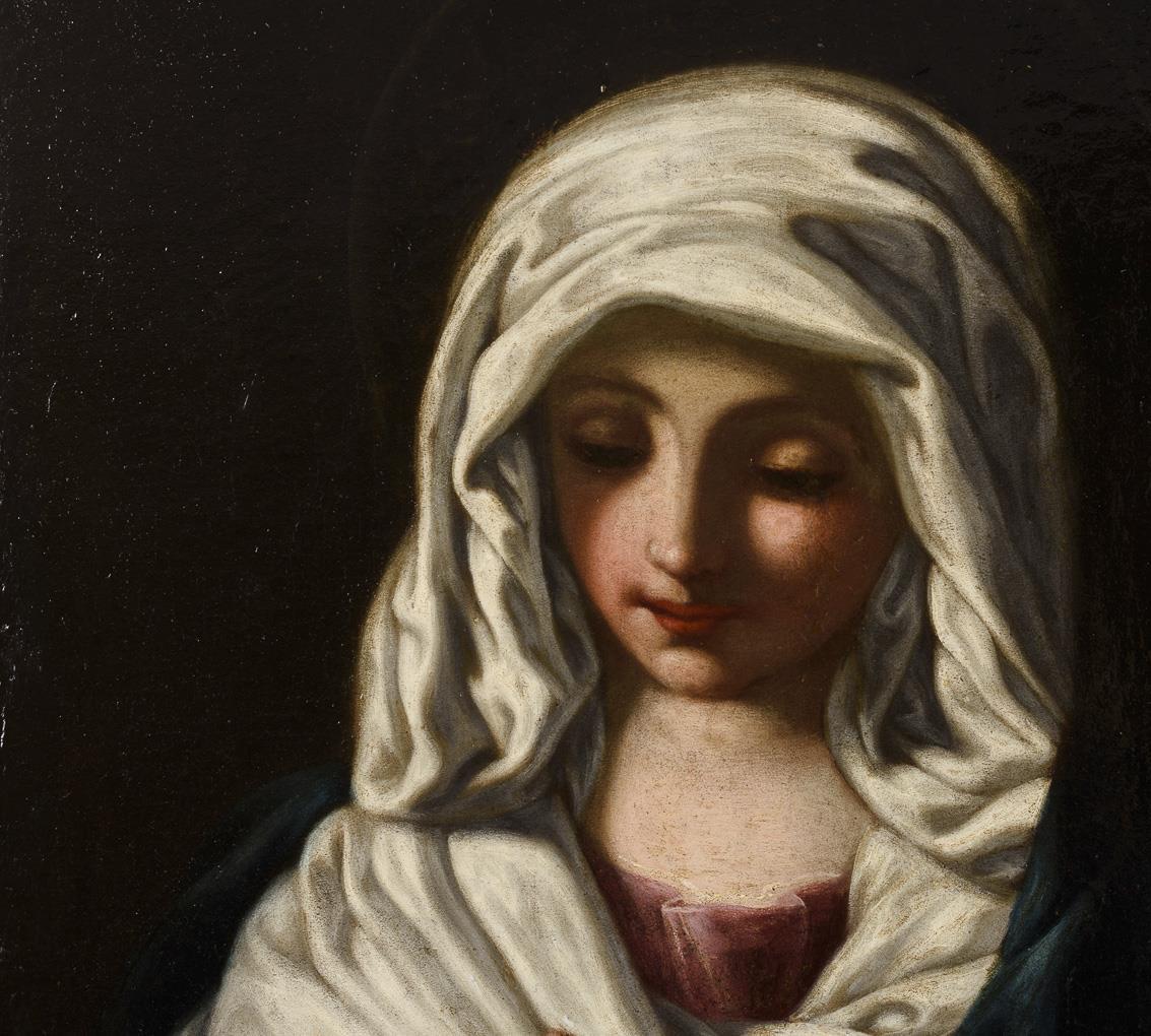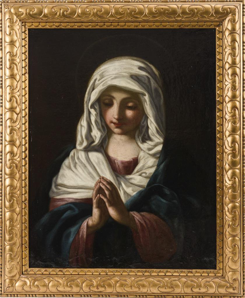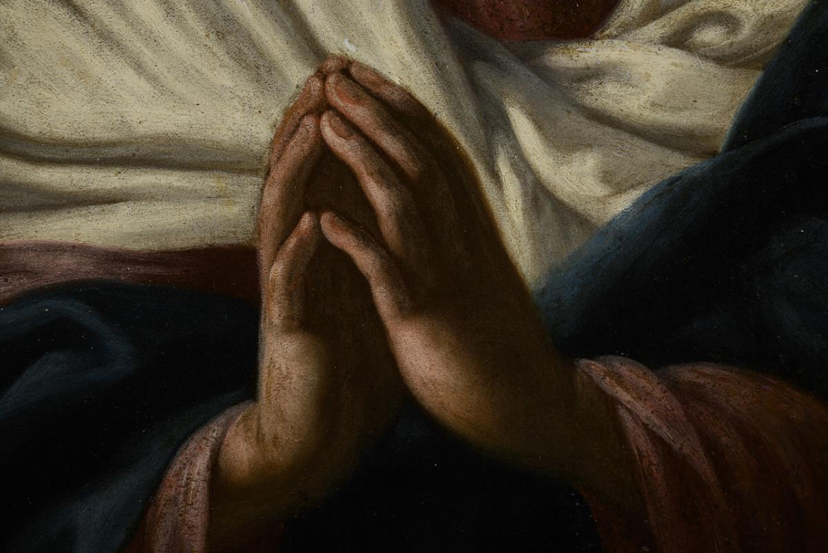 Mit zum Gebet gefalteten Händen andächtig blickende junge Maria vor dunklem Hintergrund. Leinwand doubliert.
