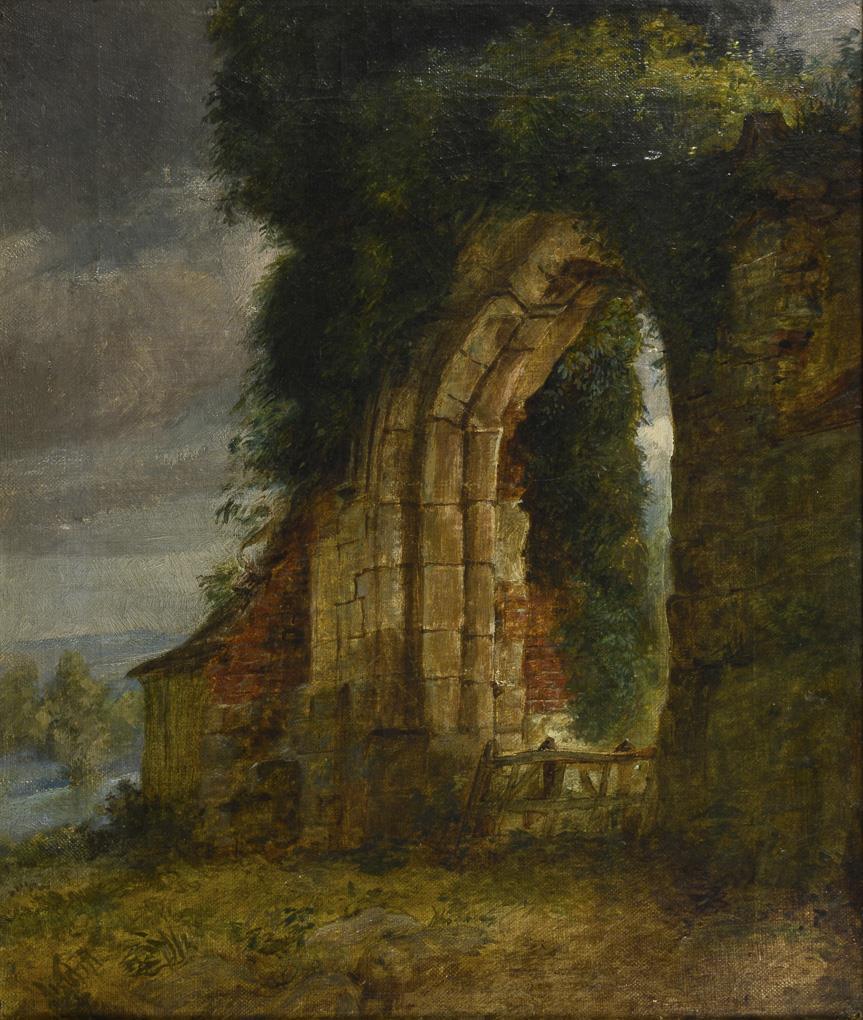 Bergige Landschaft mit überwachsenem Torbogen unter grau bewölktem Himmel. Leichte Altersspuren.