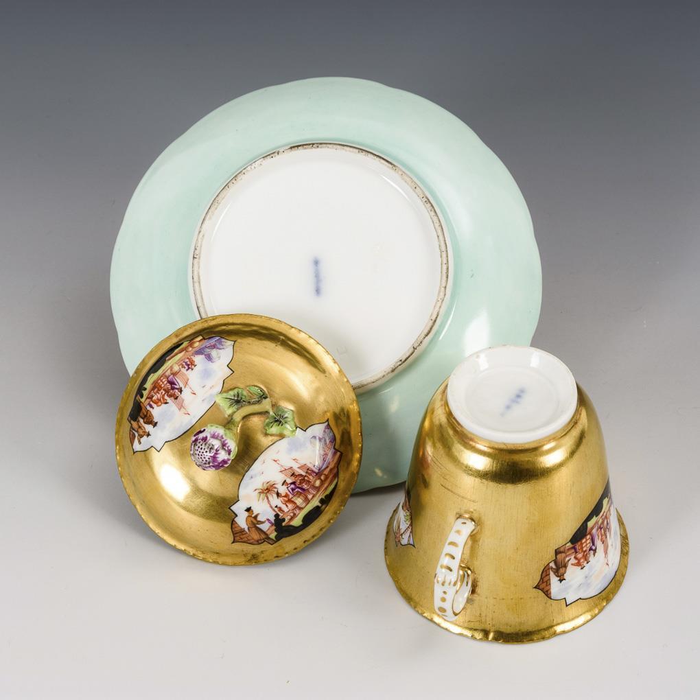 Glockentasse mit zwei Henkeln und Knaufdeckel, Untertasse mit erhöhtem, durchbrochen gearbeitetem Standring. In Ovalkartuschen die Darstellung von Hafenszenen mit Segelschiffen, Kaufleuten und Warenladungen. Deckelknauf geklebt und mit Wachs (?) fixiert, kurzer Haarriss und minimaler Goldabrieb am Rand.