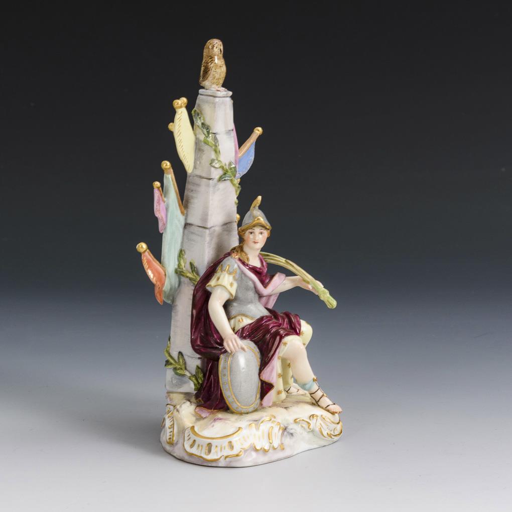 Vor einem Obelisken mit Standarten und Eule sitzende Kriegsgöttin Athene mit Helm, Harnisch und Palmwedel. Eule, Standarten, rechte Hand, Palmwedel und Helm restauriert, einige Blätter bestoßen.