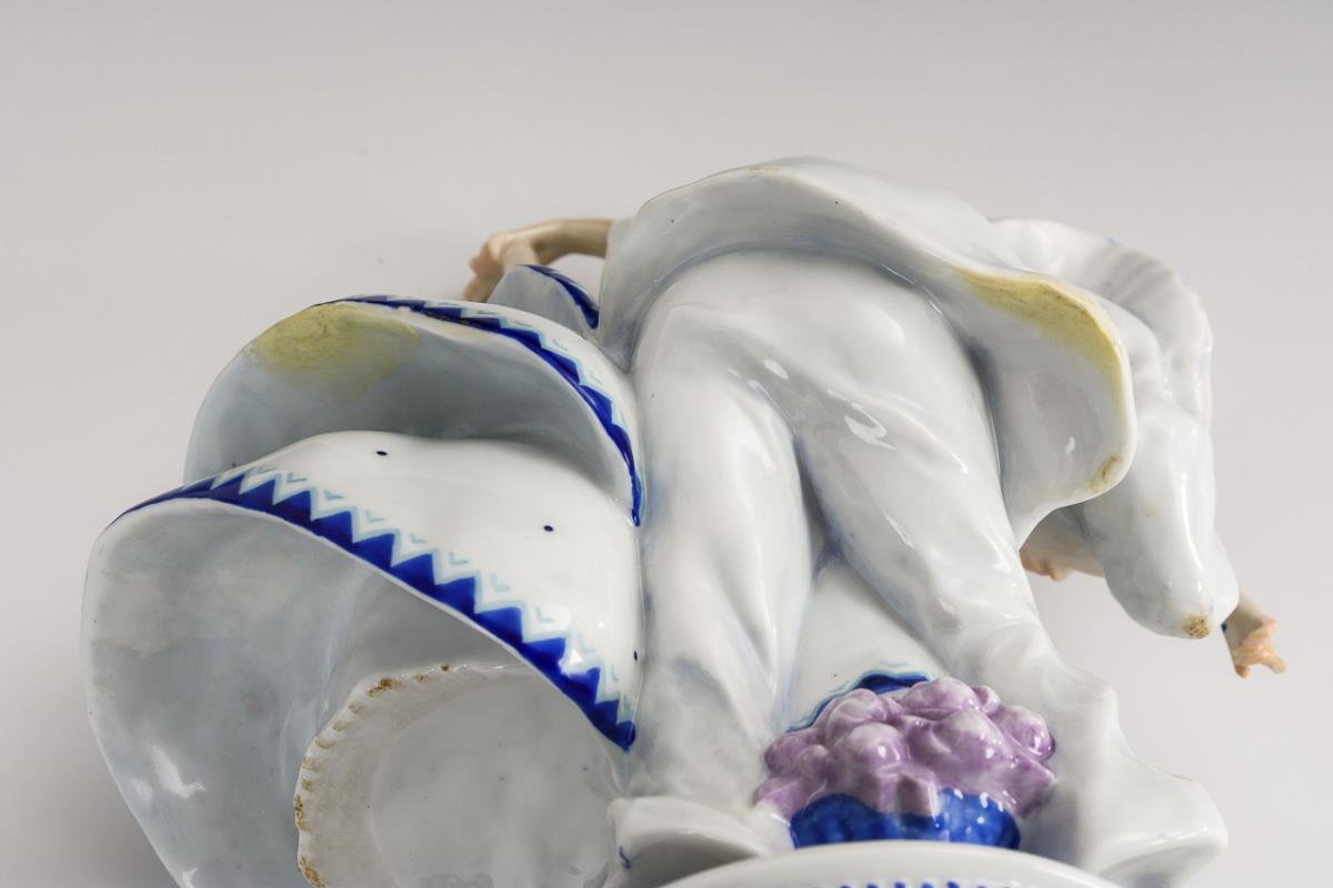 Finger der linken Hand und 1 Blüte restauriert, Zeigefinger der rechten Hand bestoßen, Restaurierung am Jackensaum und Kleidersaum.