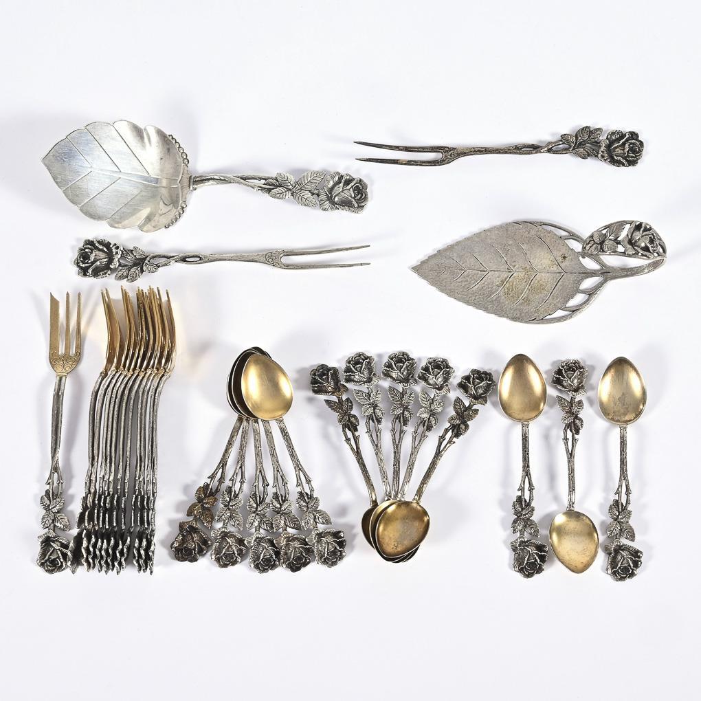 Dekor Hildesheimer Rose: 13 Kaffeelöffel, 12 Kuchengabeln und 2 Heber. Dazu 2 passende Vorlegegäbelchen aus Metall und 2 grüne Besteckhalter. Gebrauchsspuren.