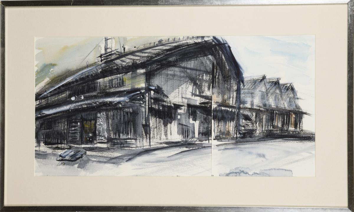 Japanischer Künstler: Häuser unter bewölktem Himmel