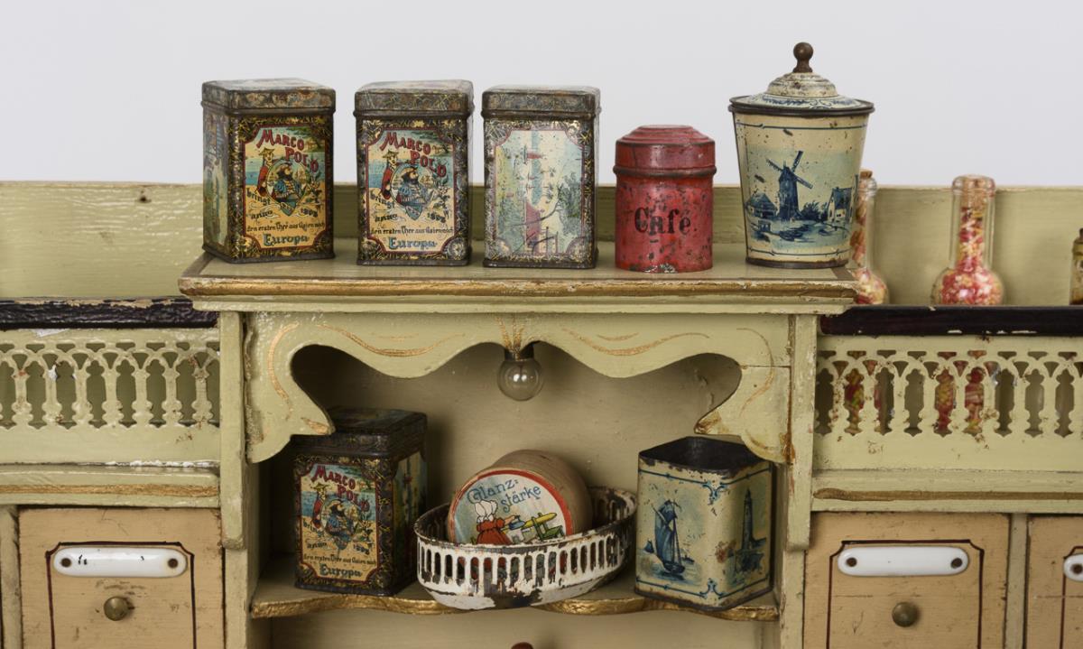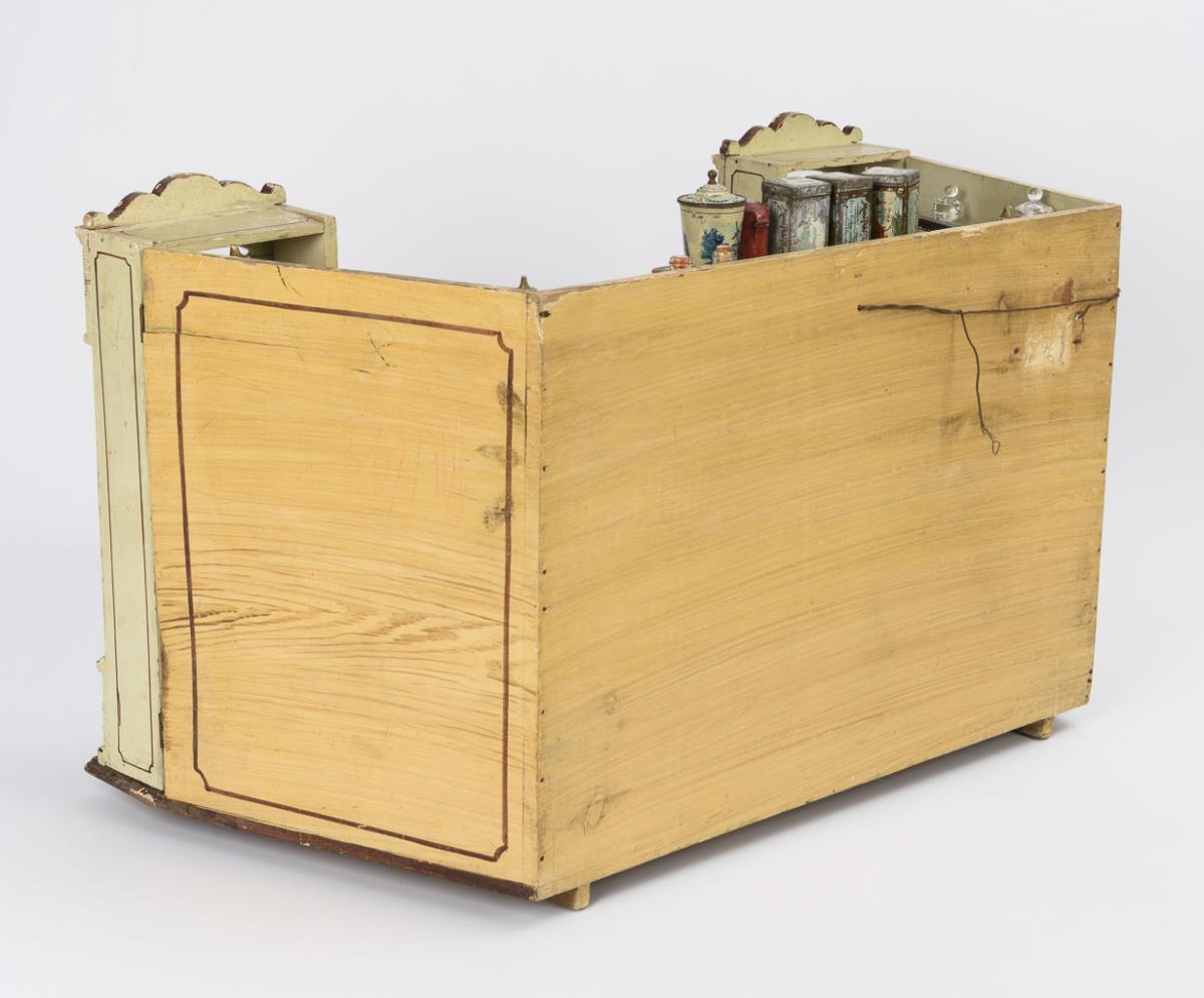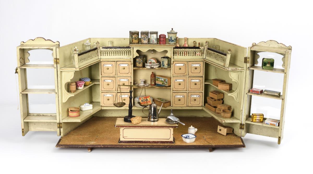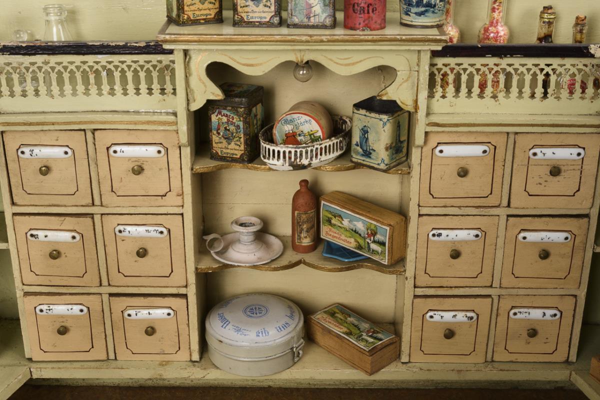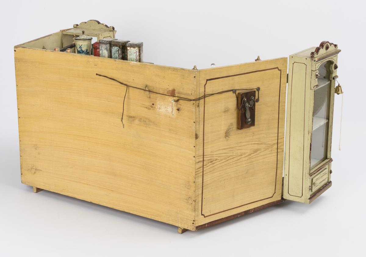 Jugendstil-Kaufmannsladen mit 2 schwenkbaren Schaufenstern.