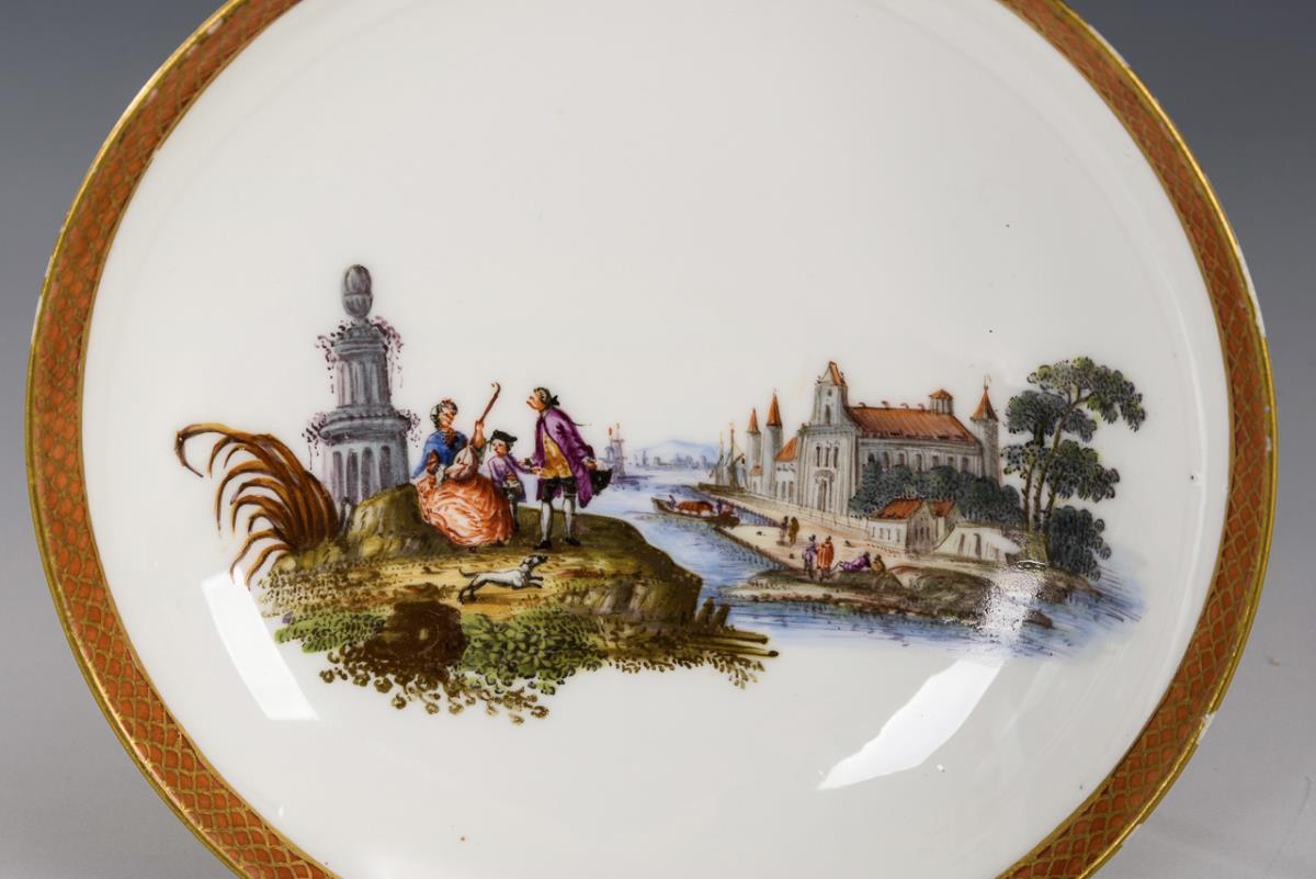 Polychrom bemalt, goldstaffiert. H Tasse 4,5 cm, Ø originale Untertasse 13,5 cm..