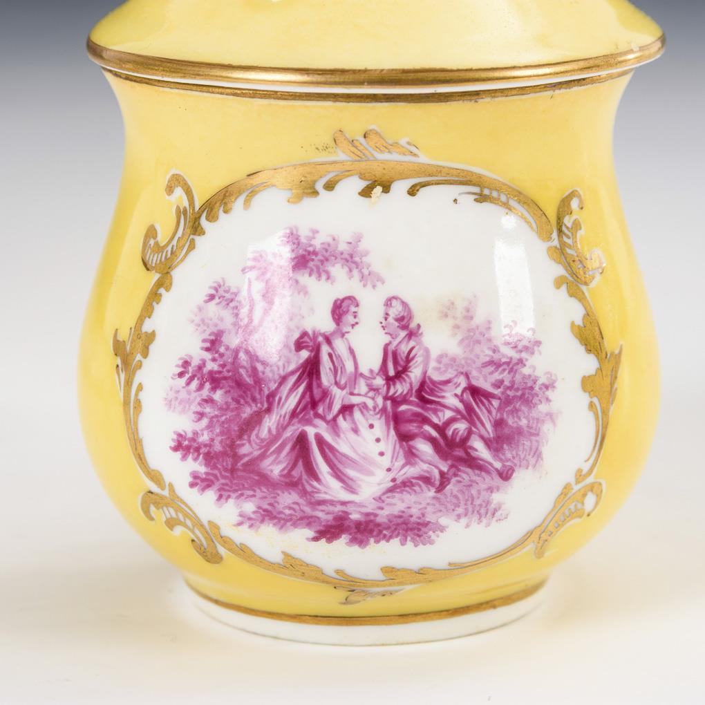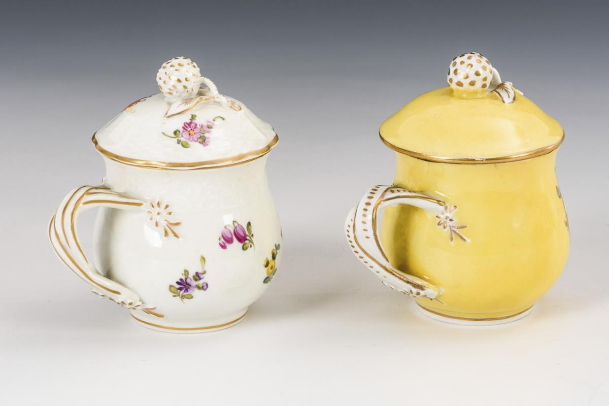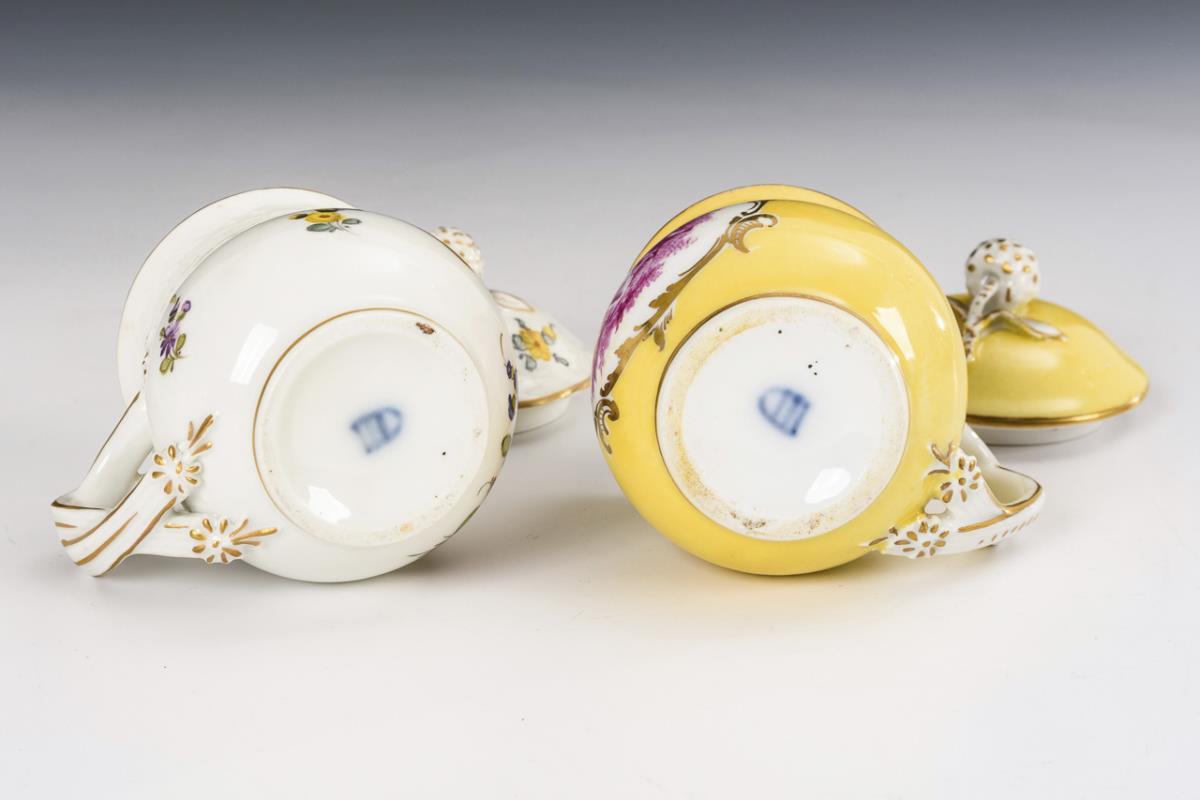 Bauchige Tassen mit gekreuztem Bandhenkel und Fruchtknaufdeckel. 1x mit gelbem Fond und einer purpurfarben gemalten Watteau-Szene in einer Rocaillekartusche. / 1x mit Blumenmalerei. 1x Deckel ergänzt.