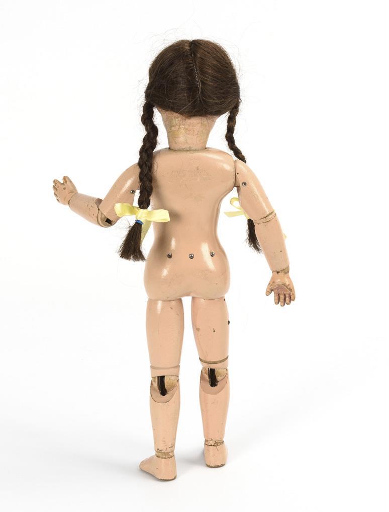 Drehbarer Kurbelkopf, braune Echthaarperücke mit Zöpfen. Voll beweglicher, 13-teiliger Gliederkörper mit Bohrungen in den Fußsohlen. Gelbes Kleid, geblümte Schürze, weiße Schuhe und Strümpfe. Gesicht übermalt, Hände und Füße mit Bereibungen.