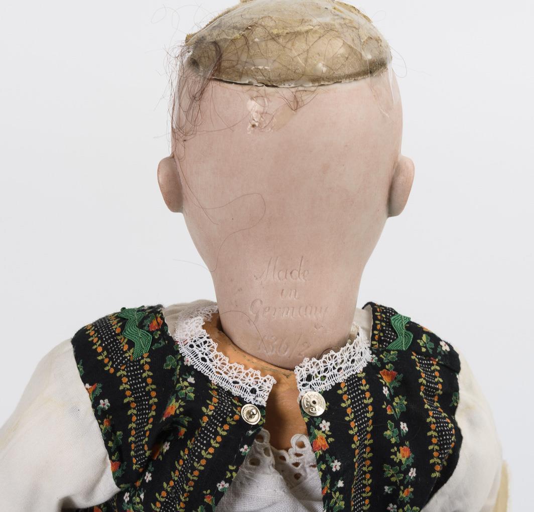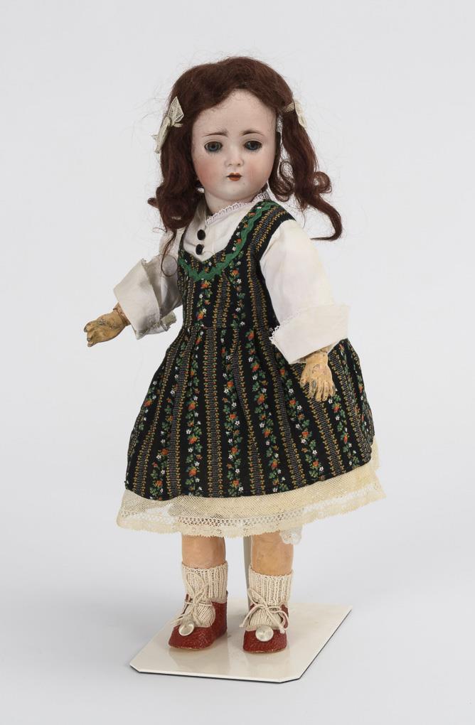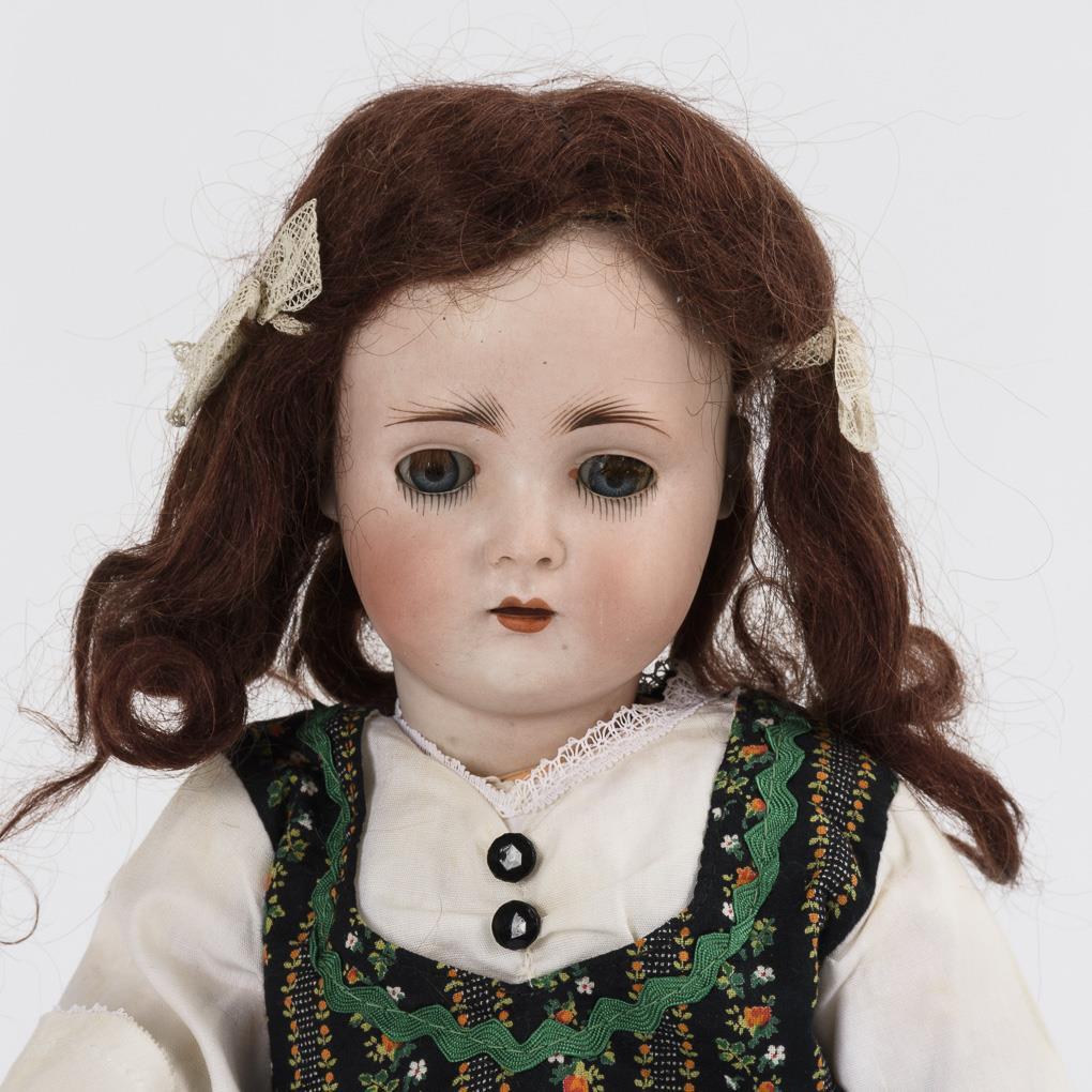 Kurbelkopf, blaue Schlafaugen, Wimpern, braune Mohairperücke. 13-teiliger Gliederkörper. Altes Kleid im Trachtenstil, alte Unterwäsche, jünger ergänzte rote Schuhe. Kopf durchleuchtet: ohne Defekte. Körper alt bespielt, Oberschenkel ergänzt.