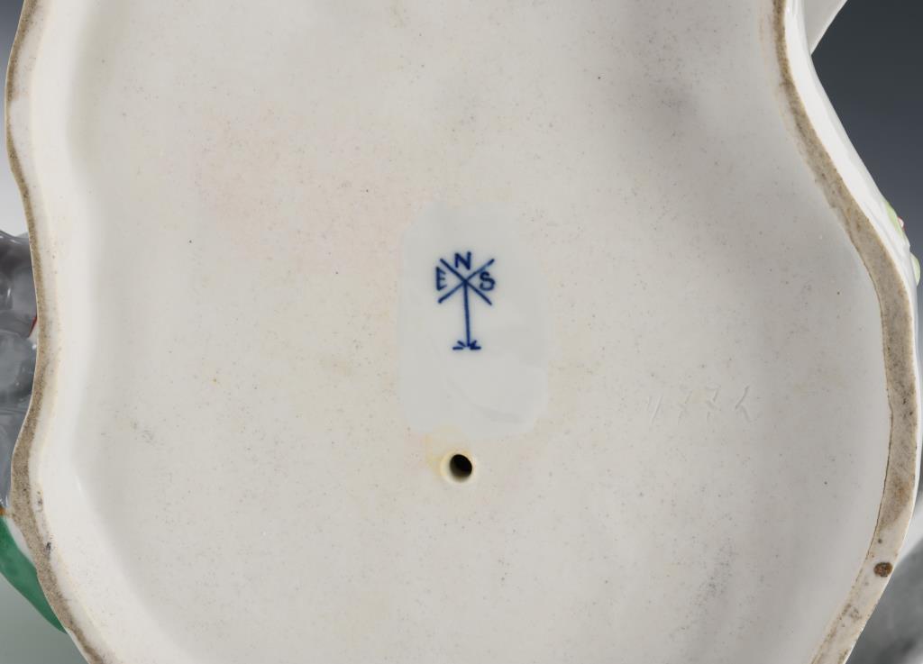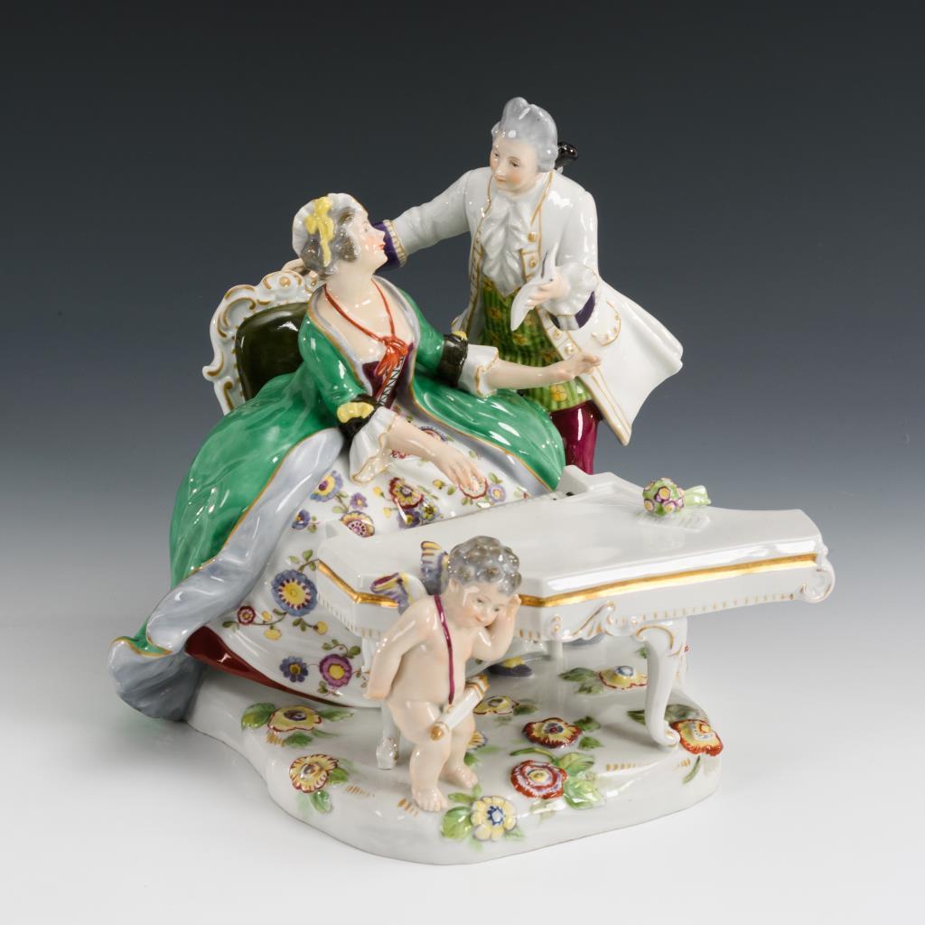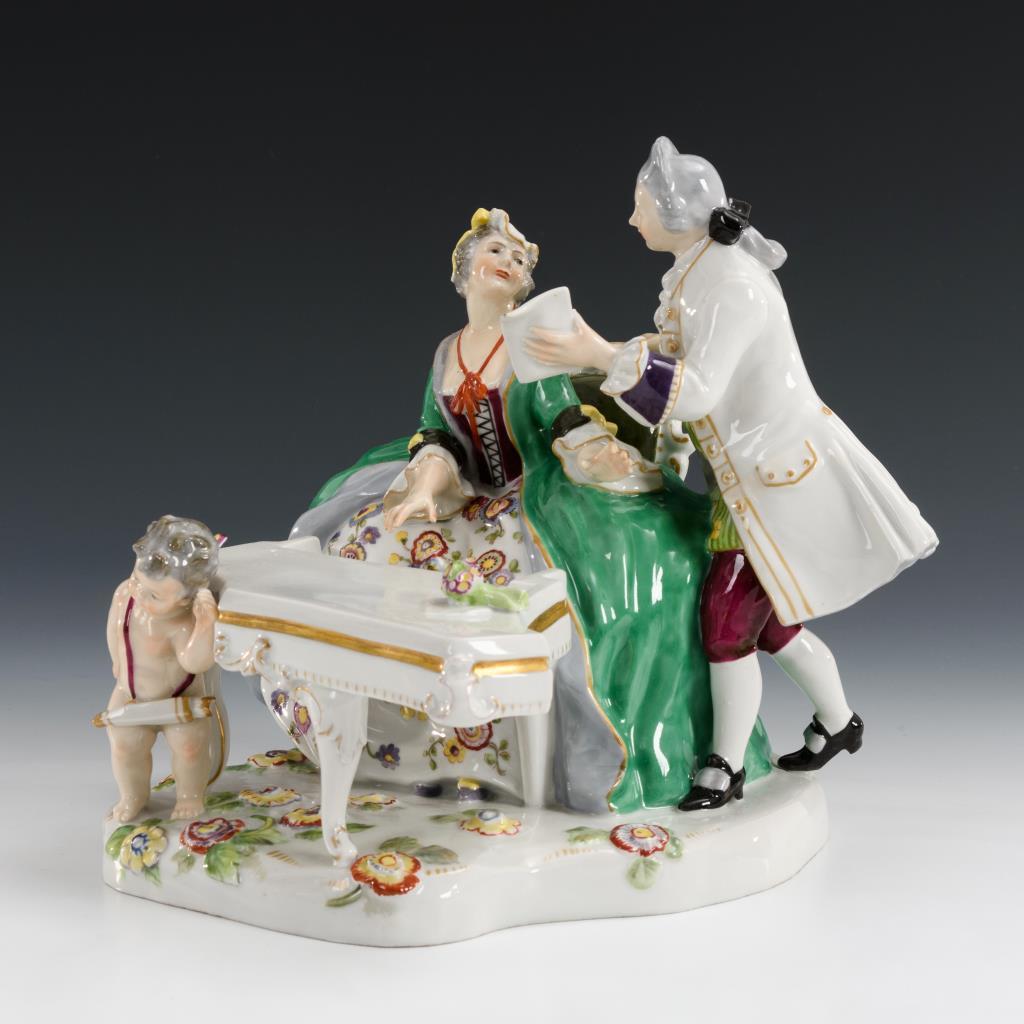Der Dame am Spinett ein Notenblatt reichender Rokokoherr, vor dem Spinett ein lauschender Amorknabe stehend. Rechte Hand des Herren sowie beide Hände und Kopf der Dame restauriert.