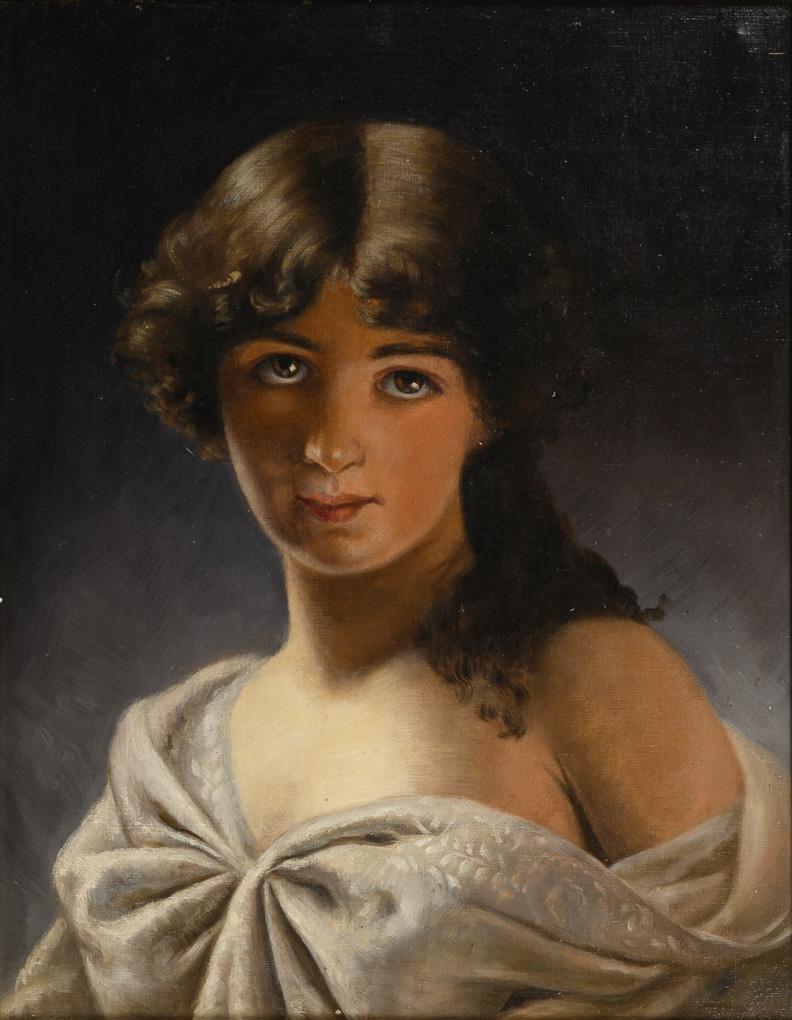 Bildnis eines Mädchens mit dunklem Haar und entblößter Schulter vor neutralem Hintergrund. Nachtrag 21.10.22: Kopie nach Josef Lieck (*1849) "Mädchenbildnis (Dämmerstunde)".