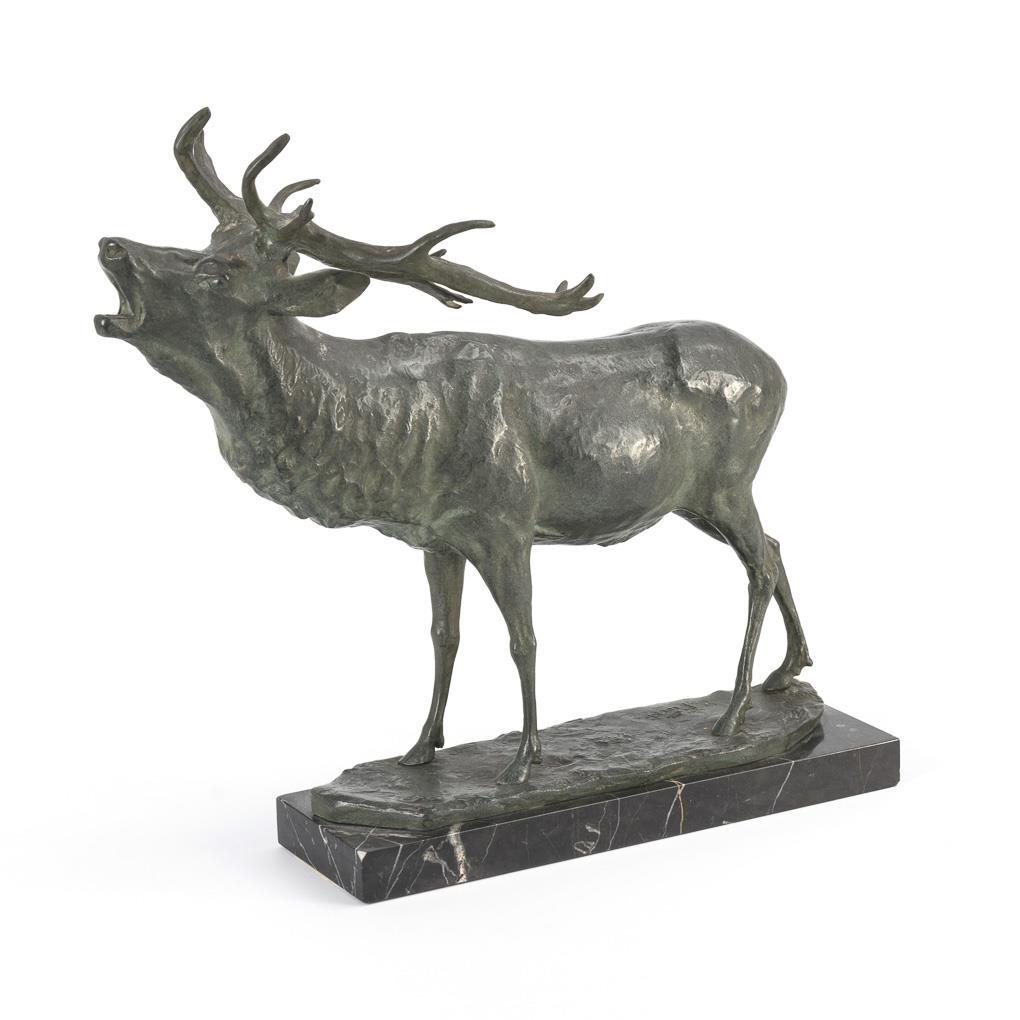 Régule bronzefarben grünlich patiniert, schwarze Marmor-Plinthe. Bezeichnet, Gießermarke "Kraas Bildguss". H 40 cm, gesamt 43 x 46 x 19 cm.