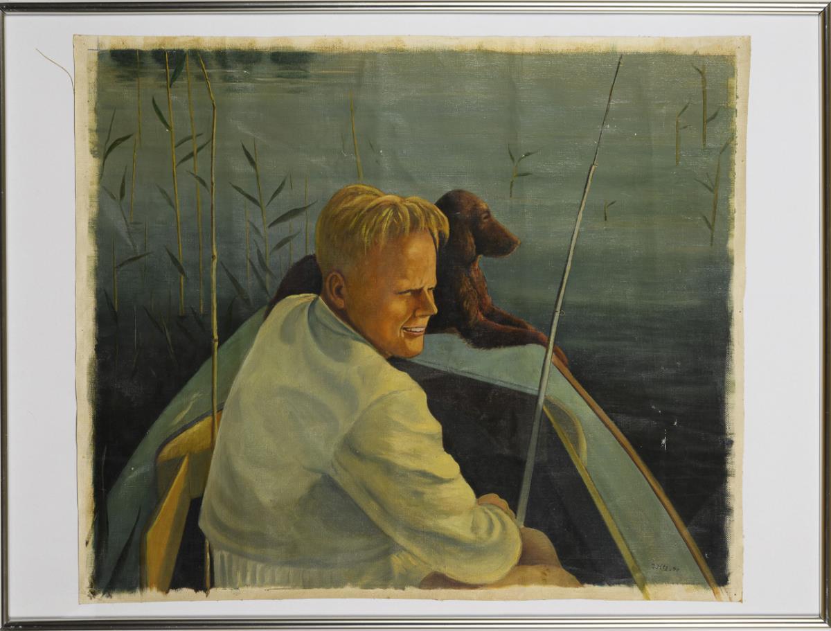 Junger Mann mit Hund und Angel im Boot im warmen Sonnenschein nahe dem Schilf. Leichte Altersspuren.
