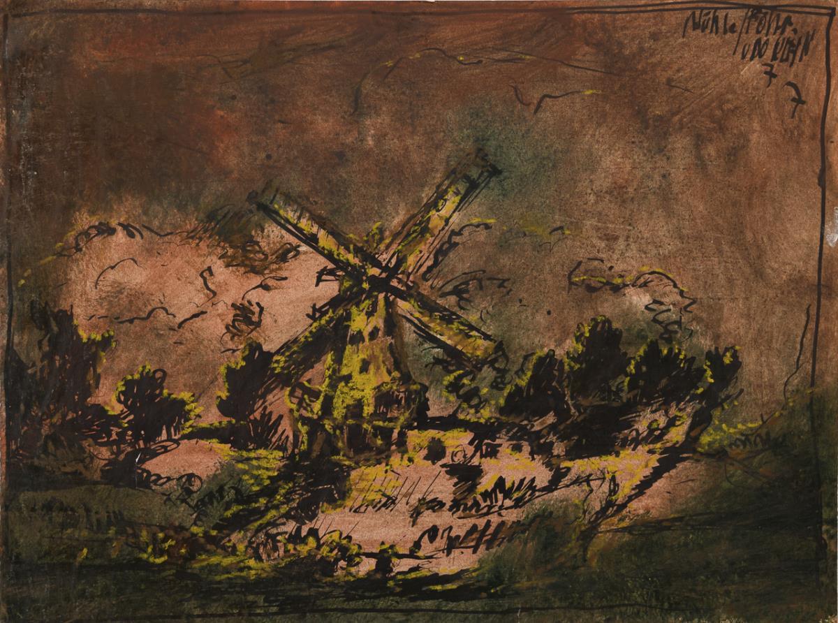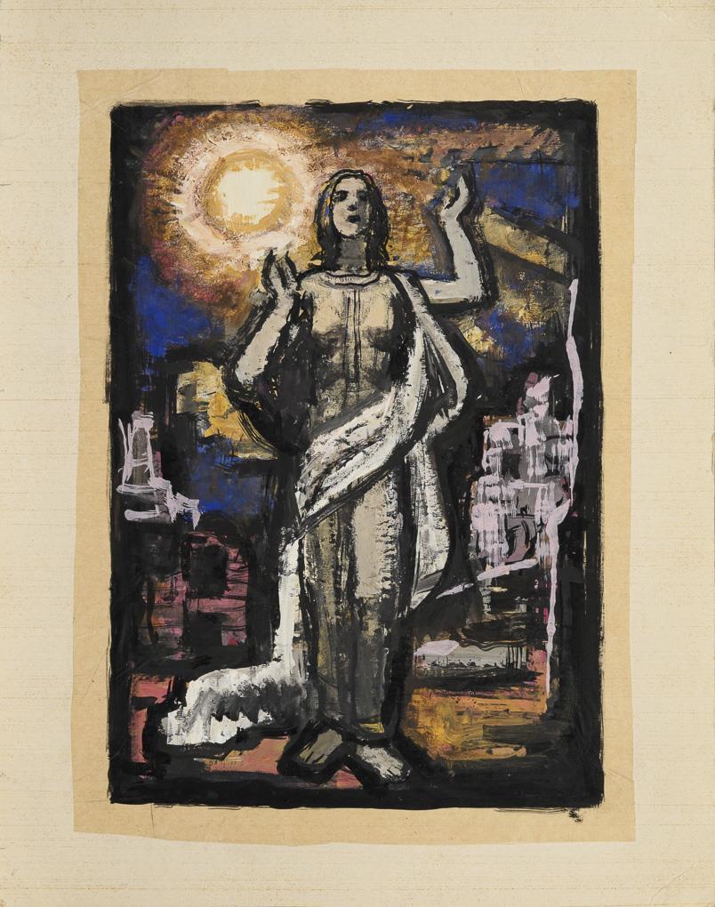Verschiedene Motive und Kompositionen, darunter zwei religiöse Arbeiten von Hans List (1902 Berlin - 1977 Altötting) mit Frauenfiguren in andächtiger Haltung unter scheinender Sonne und zwei Arbeiten der DDR-Künstlerin Helga Schmidt-Römhild. Teils Knicke und kleine Risse am Rand.