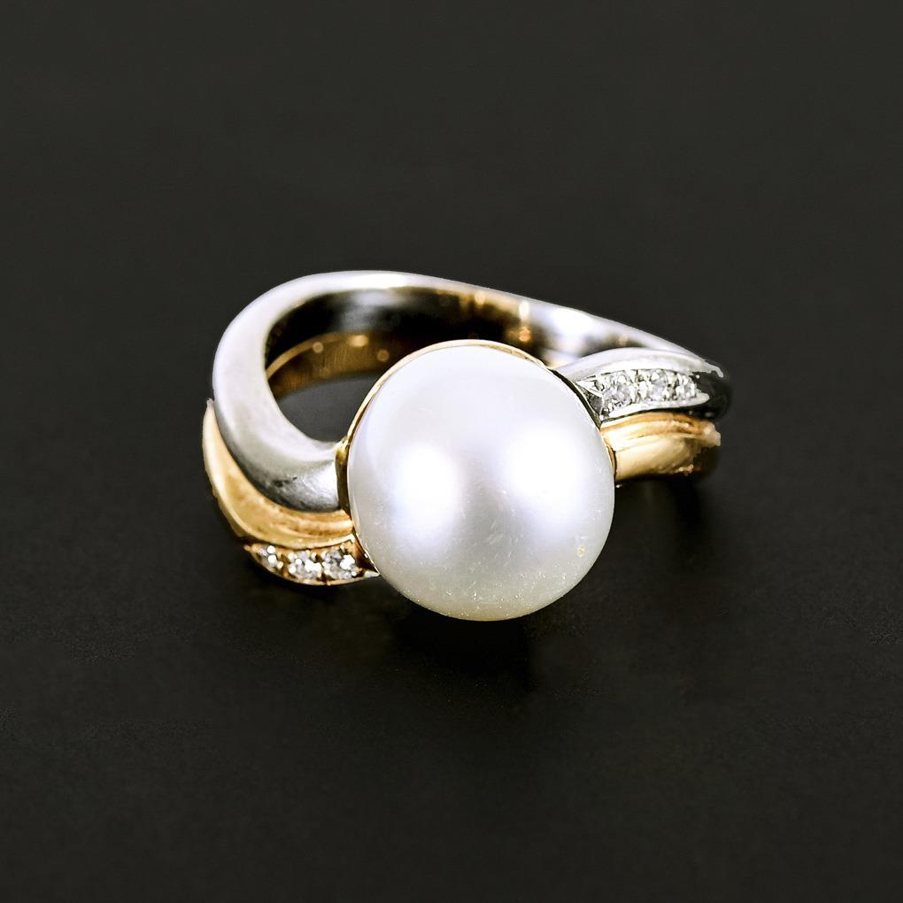 Gelbgold 750/Platin 950 gestempelt. Ringgröße 48. Zuchtperle Ø ca. 11 mm. 11,6 g.