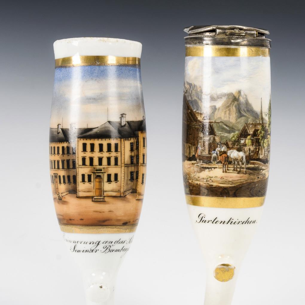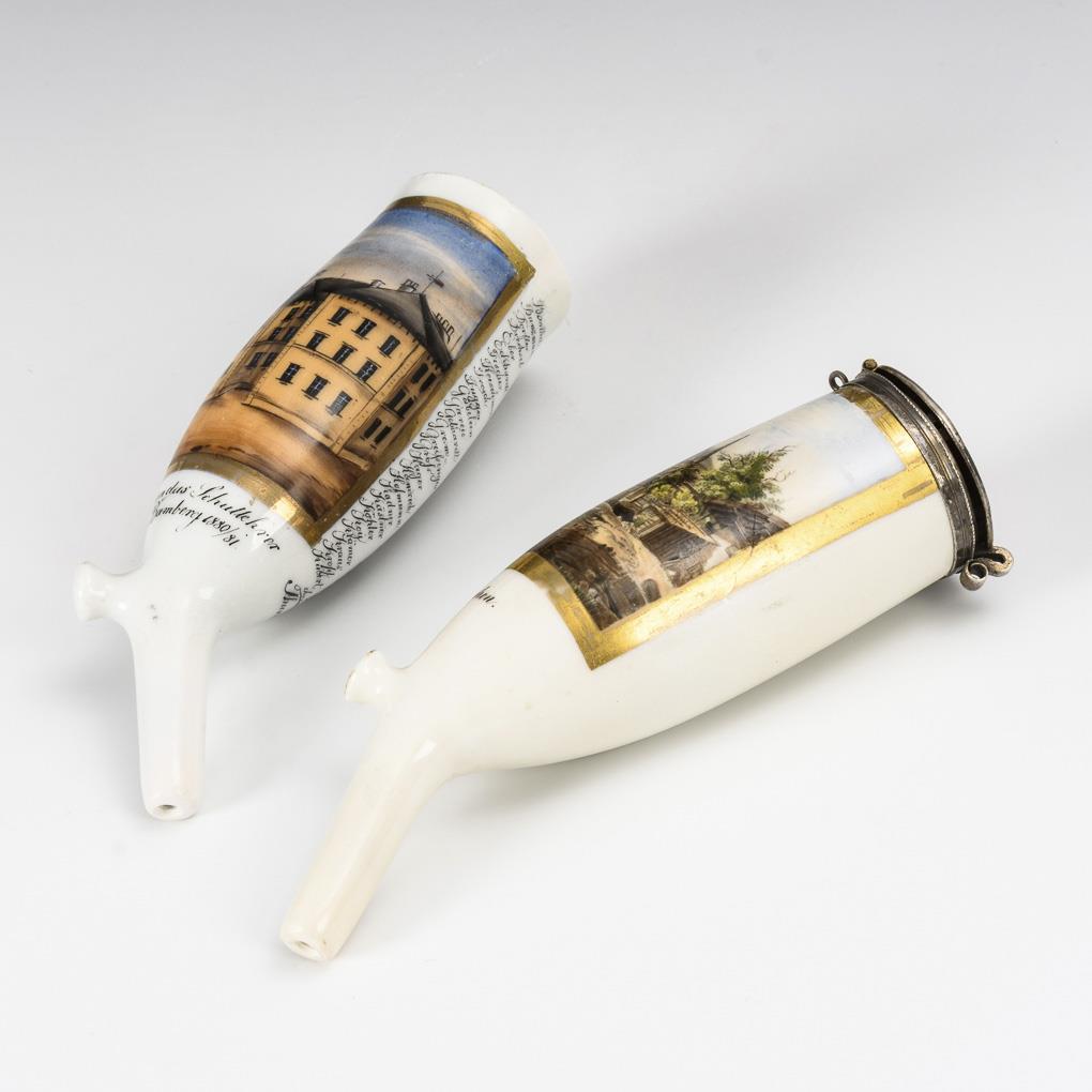 1x mit der bezeichneten Ansicht des "Schullehrer Seminars" in Bamberg 1880/81. / 1x mit der bezeichneten Ansicht des Ortes Partenkirchen um 1878. 1x restauriert und Deckel etwas gedellt.
