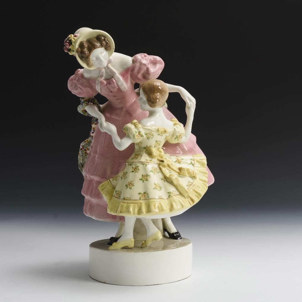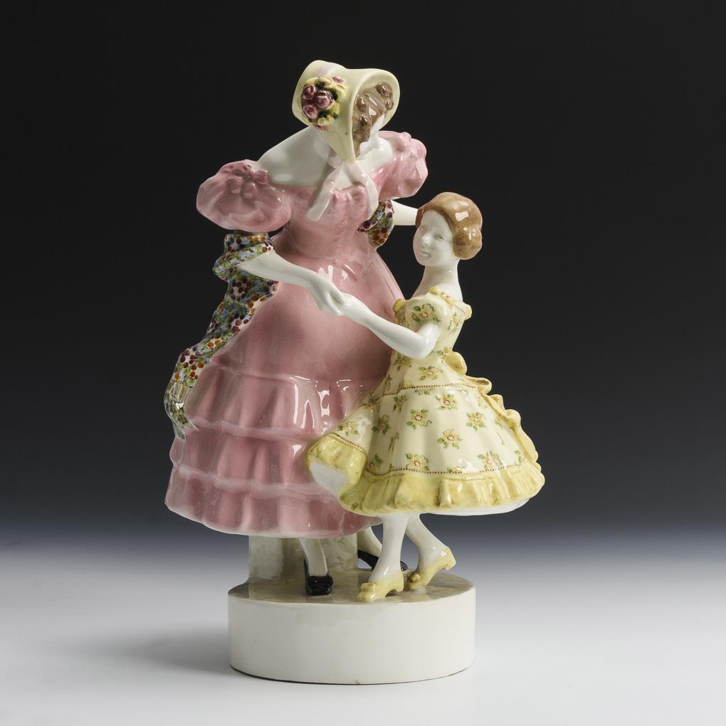 Biedermeier-Dame und Mädchen in Krinolinenkleidern, auf Rundsockel. Linke Hand bestoßen.
