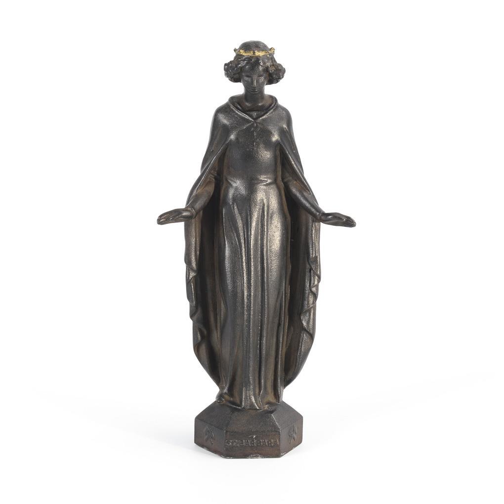 Eisenguss geschwärzt, teils goldbronziert. Mit Monogramm "MH" bezeichnet, betitelt mit Bergbausymbolen. H 37 cm.